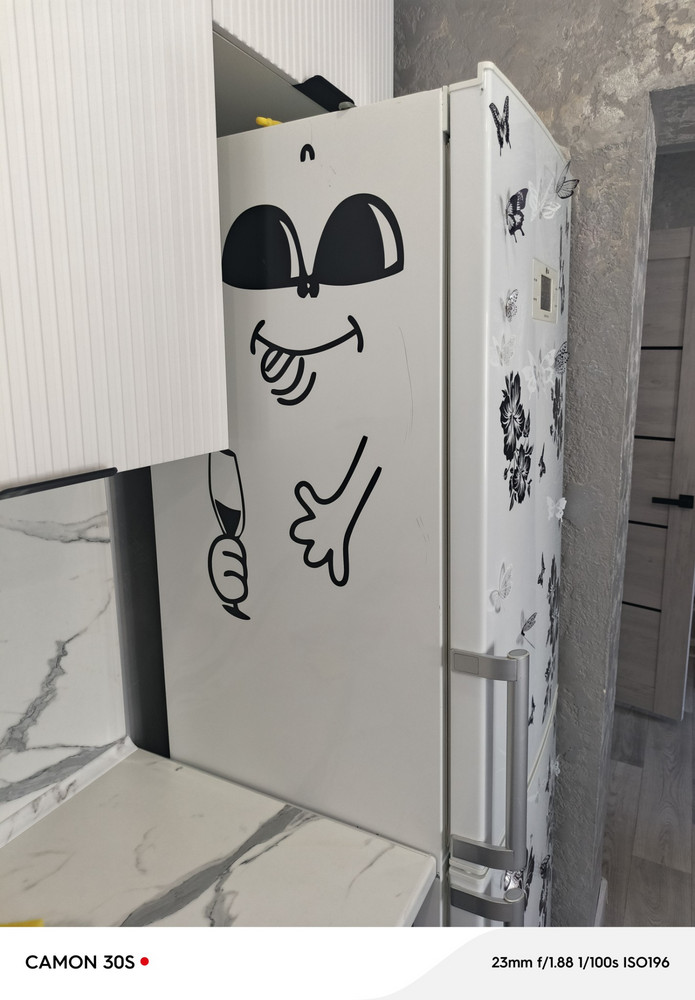 Интерьерная наклейка на виниловой плёнке Oracal создаёт стильное оформление кухонного пространства, холодильника или стены. Она обеспечивает прочное приклеивание на гладких поверхностях, устойчивость к влаге и мытью, а также сохранение цвета при солнечном освещении. Лёгко снимается без следов клея, не имеет запаха и подходит для бытового использования.