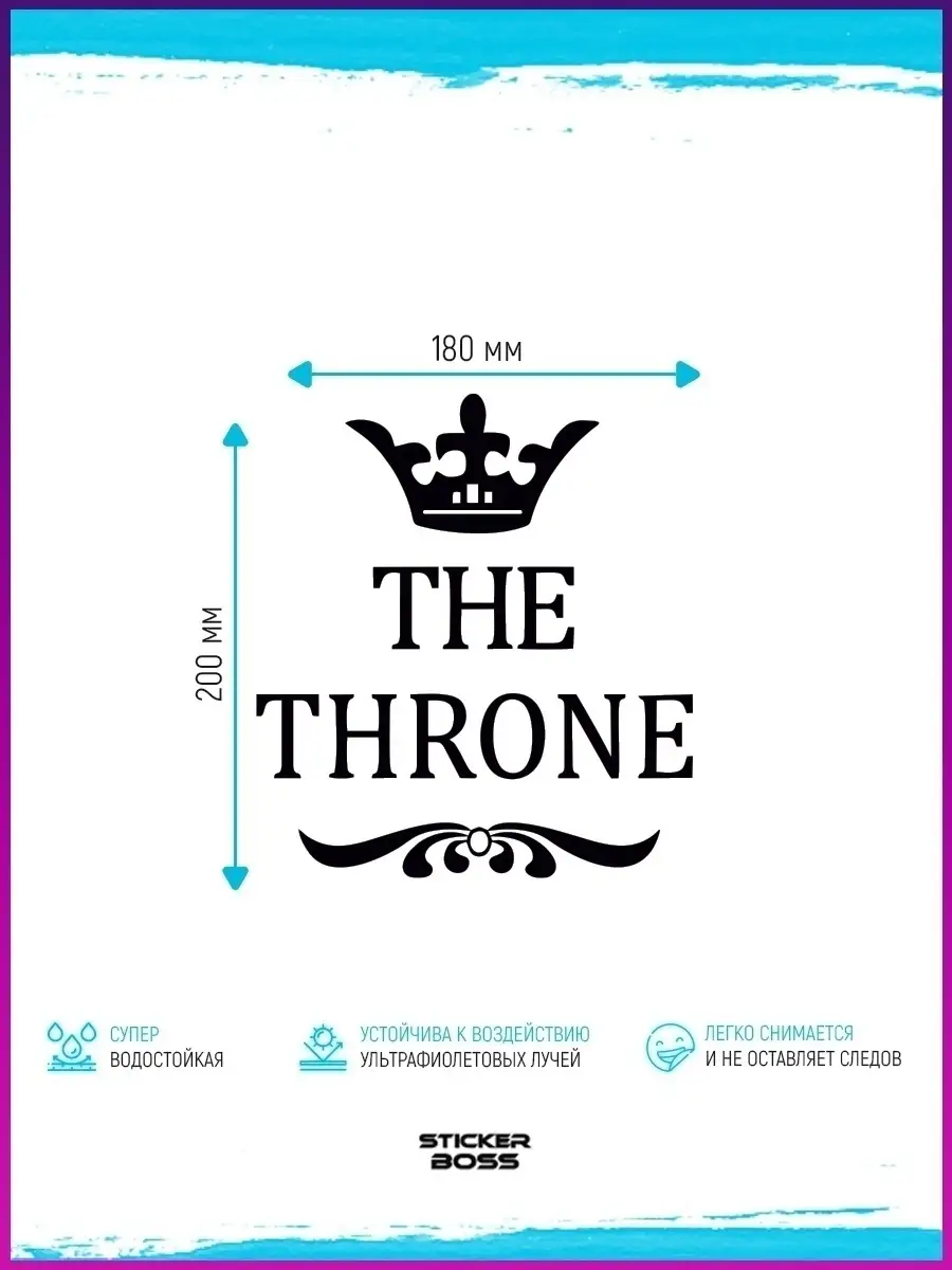 Наклейка интерьерная на унитаз THE THRONE ТРОН изготовлена на прочной виниловой пленке ПВХ Oracal, специально для интерьерного декора. Благодаря влагостойкости и устойчивости к мытью она сохраняет внешний вид на длительное время. Наклейка не выцветает на солнце и легко снимается без следов, что позволяет менять дизайн без повреждений поверхности.
