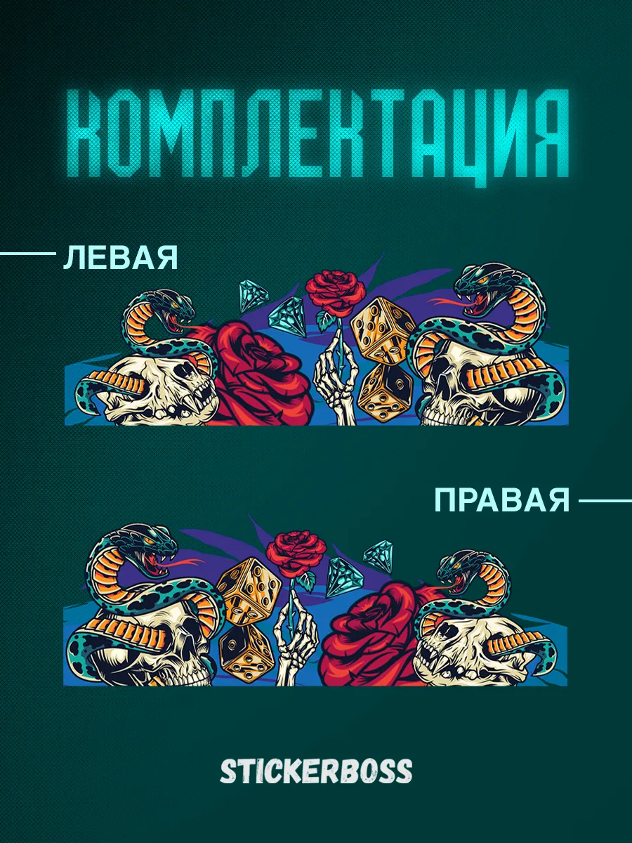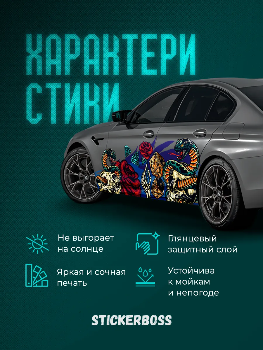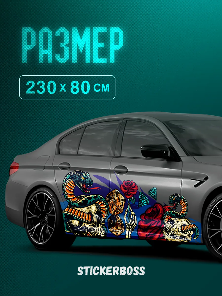 В каталоге STICKERBOSS вы найдете вариацию дизайна змеи, которая подходит для борта автомобиля. Наличие такой ливреи поможет выделиться на фоне других транспортных средств.
