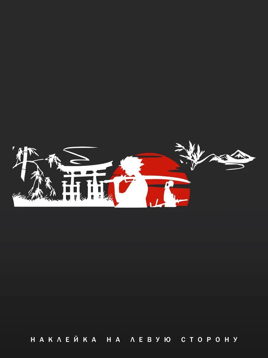 Дизайн включает силуэт самурая на фоне восходящего солнца, гор, изящного бамбука и ворот тории. Композиция выполнена в двух классических цветах — красном и белом, что обеспечивает контраст и выразительность.