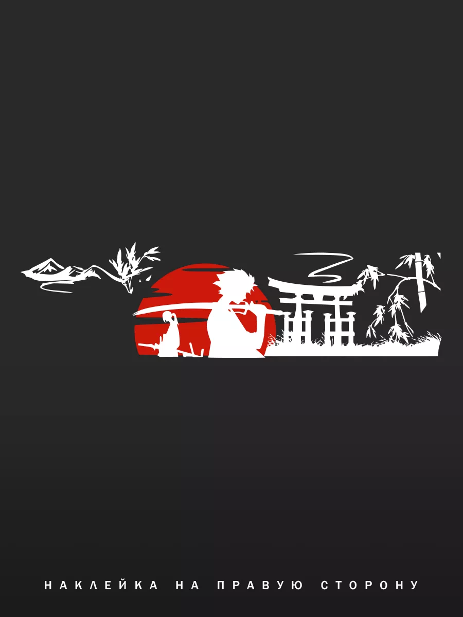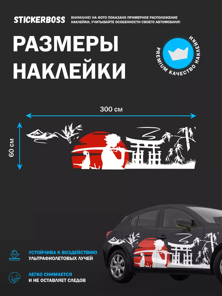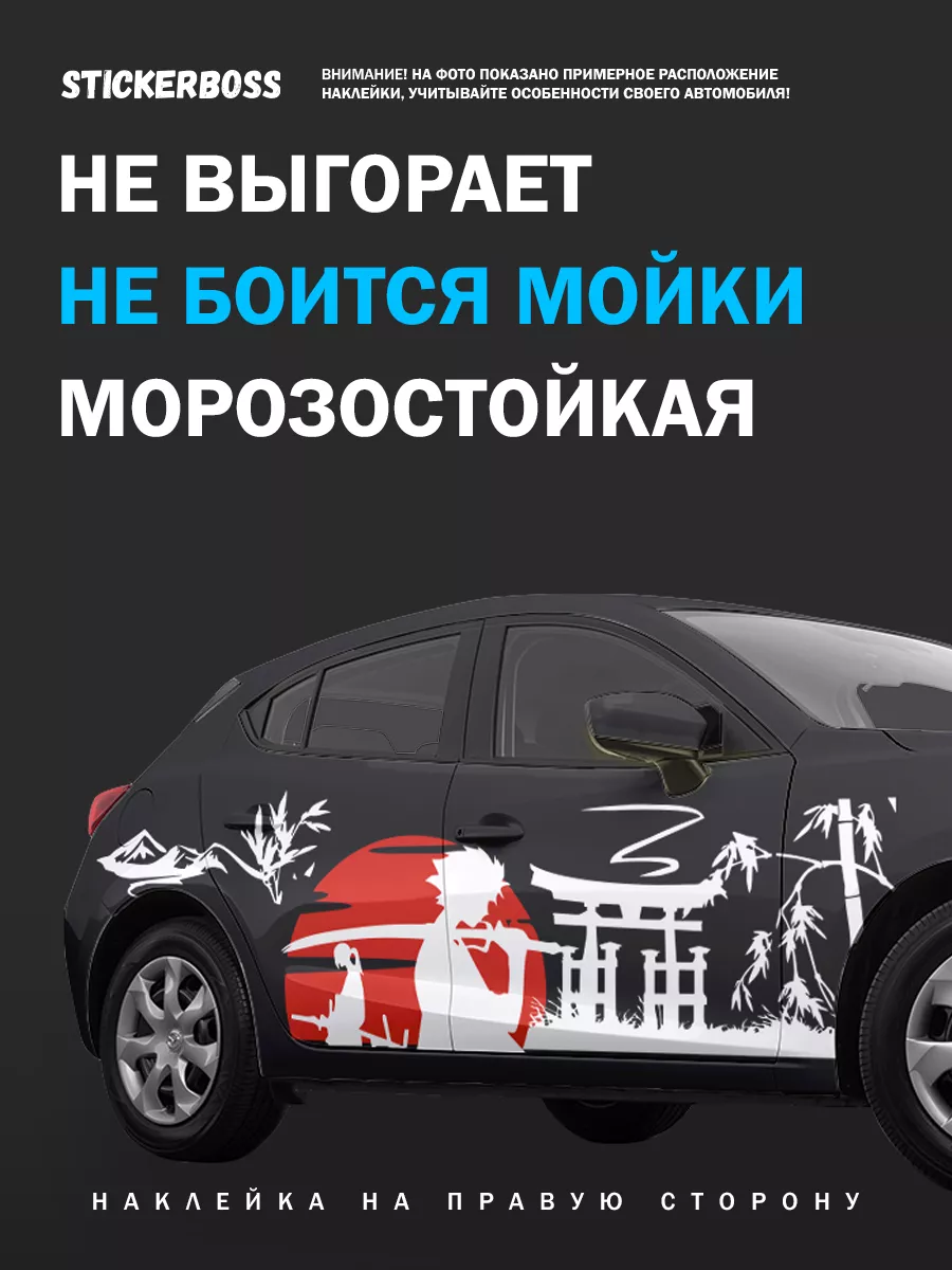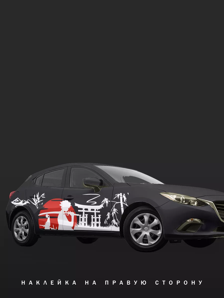 Эта наклейка-ливрея позволяет преобразить внешний вид автомобиля за счет выразительного дизайна с силuetой самурая на фоне восходящего солнца и гор. Размер композиции 300×60 см обеспечивает эффектный охват правого борта, включая двери и крыло, создавая цельный и стильный образ на дороге.