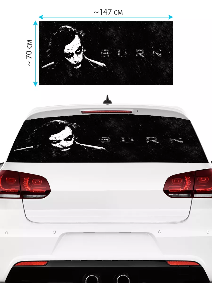 Наклейка на заднее стекло Джокер 150x70 см — декоративная внешняя наклейка для автомобиля. Она выполнена из самоклеящейся виниловой пленки ПВХ с перфорацией по всей площади, что обеспечивает сочетание стиля и приватности, а также сохраняет видимость через стекло в салоне. Стикер рассчитан на большинство моделей: седан, хэтчбек или универсал. Элементы можно подрезать для точной подгонки. Наклейка легко снимается без следов, если понадобится заменить дизайн или возвратить стекло к исходному виду.