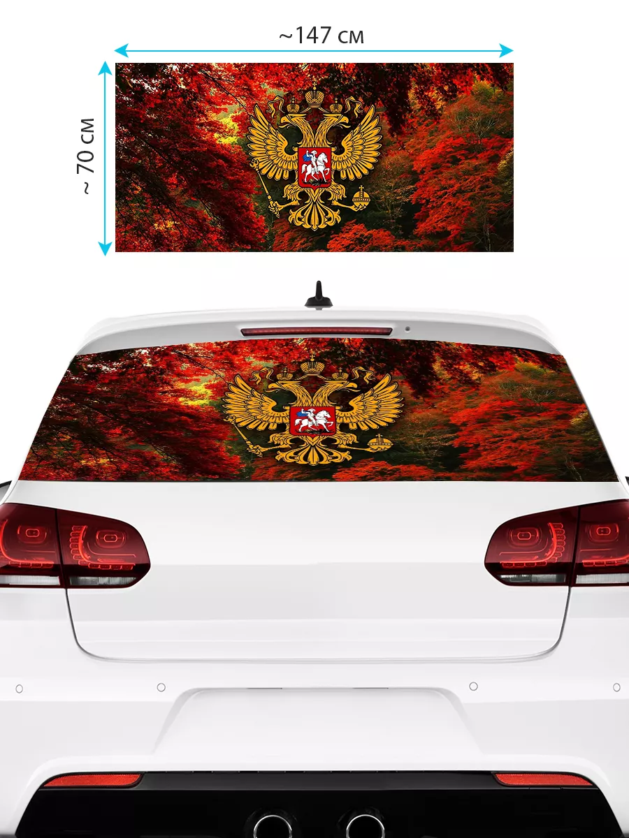 Наклейка на заднее стекло автомобиля Герб России 217 представляет собой крупную декоративную наклейку, выполненную из перфорированной виниловой пленки ПВХ. Размер 150х70 см универсален и подходит для большинства моделей.