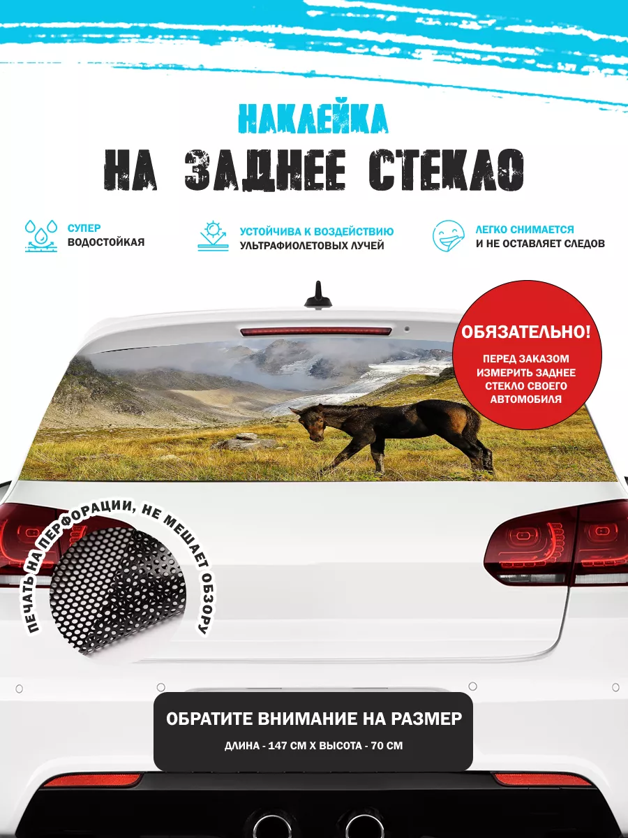 Наклейка на заднее стекло горы кони 96 — декоративная перфорированная наклейка для стекла, изготовленная из самоклеящейся виниловой пленки ПВХ. Размер 150×70 см делает ее универсальной для большинства автомобилей: седан, хэтчбек и универсал. При необходимости лист можно подрезать под нужный размер. Наклейка упакована в защитную тубу для сохранности во время доставки.