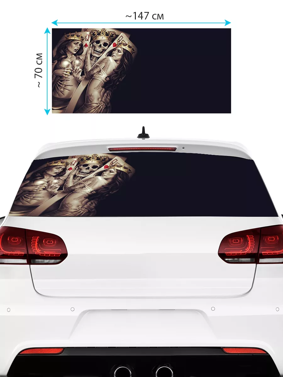 Наклейка на заднее стекло авто Карты Череп 527 — крупная декоративная перфорированная наклейка, предназначенная для тыловой части автомобиля. Размер 150×70 см позволяет использовать ее на большинстве популярных кузовов, включая седаны, хэтчбеки и универсалы. Наклейка выполнена из самоклеящейся виниловой пленки ПВХ с перфорацией, что обеспечивает надежное крепление и визуально легкую прозрачность для заднего стекла.