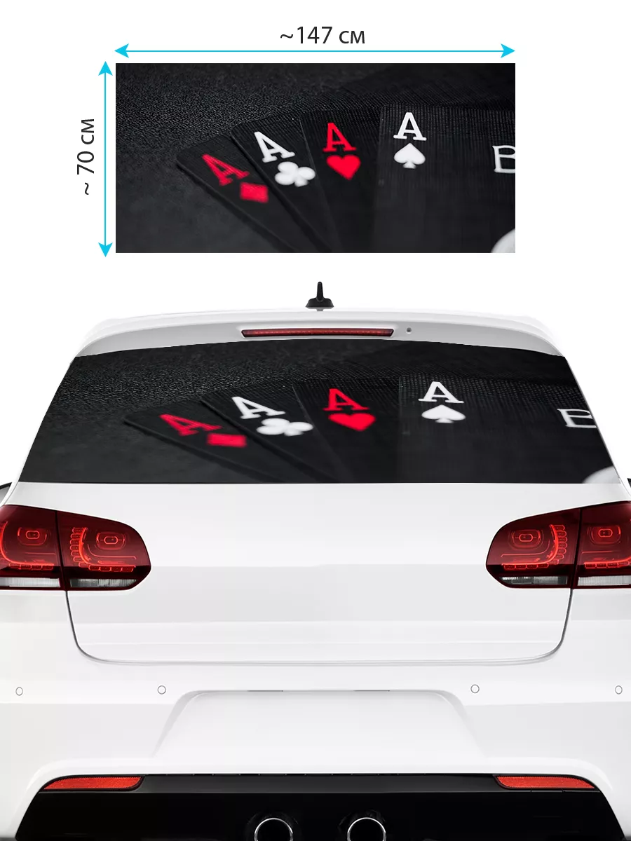 Преимущества наклейки на заднее стекло автомобиля заключаются в стильном дизайне, приватности и универсальности применения. Эта наклейка размером 150х70 см подходит для большинства автомобилей: седан, хэтчбек или универсал. При необходимости лист можно подрезать до нужного размера. Товар упакован в защитную тубу для сохранности во время доставки. Наклейка с дизайном Карты Покер позволяет выбрать индивидуальный стиль и сделать интерьер вашего автомобиля ярче.