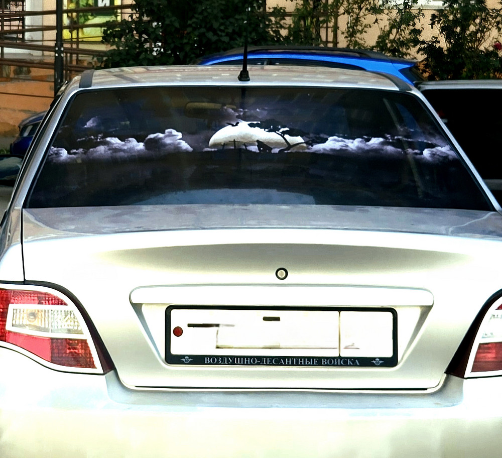 Основа наклейки — самоклеящаяся виниловая пленка ПВХ, что обеспечивает надежное приклеивание к поверхности стекла. Перфорированная площадь позволяет создать эффектный вид без полного затемнения заднего стекла. Снятие не оставляет следов.