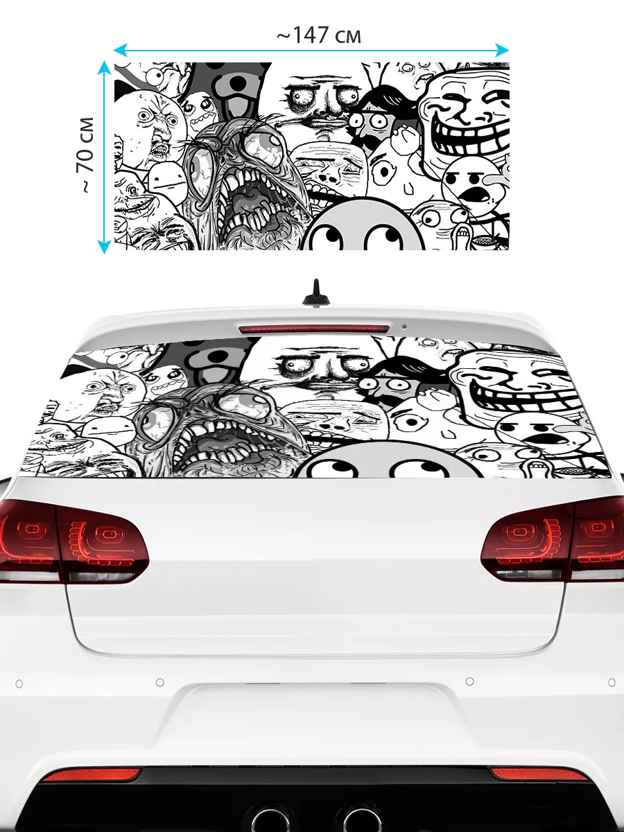 Это большая декоративная наклейка для заднего стекла автомобиля. Она выполнена из перфорированной самоклеящейся виниловой пленки ПВХ и обеспечивает стильный внешний вид, сохраняя приватность за счёт перфорации. Размер 150×70 см подходит большинству автомобилей: седан, хэтчбек, универсал. При необходимости можно подрезать лист под нужный размер. Наклейка устойчива к любым мойкам, влаге и агрессивным погодным условиям и не выгорает на солнце. При желании легко снимается без следов. В ассортименте множество вариантов: принты с мемами, животные, флаги, города и другие мотивы. Товар упаковывается в защитную тубу для сохранности во время доставки.