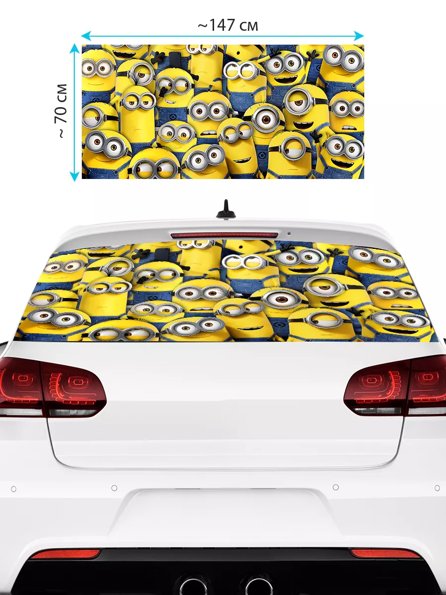 Большая наклейка на заднее стекло авто с принтом Миньоны — декоративное решение для стильного тюнинга. Перфорированная самоклеящаяся виниловая пленка ПВХ обеспечивает прочность и защиту от погодных условий, а универсальный размер 150х70 см позволяет легко подобрать под большинство стекол. При необходимости можно подрезать лист под нужный размер.