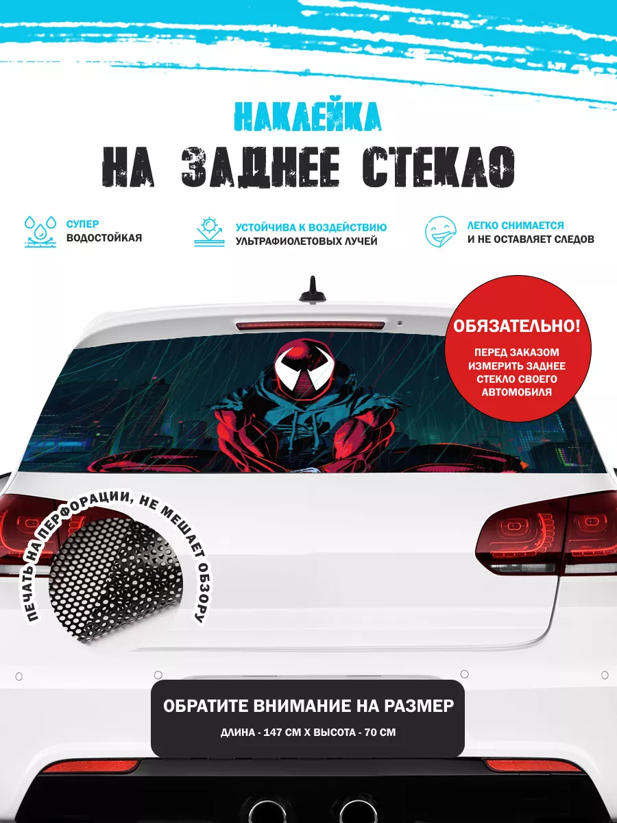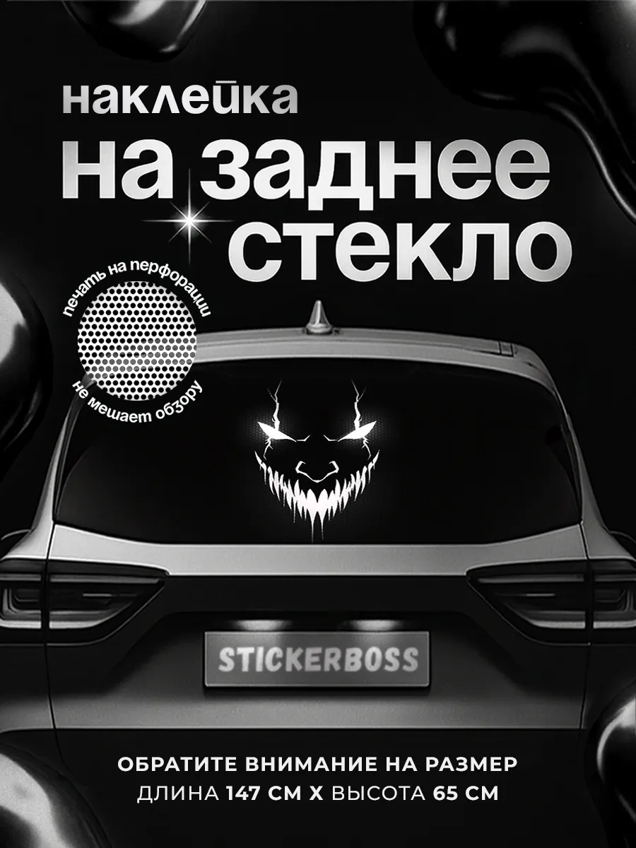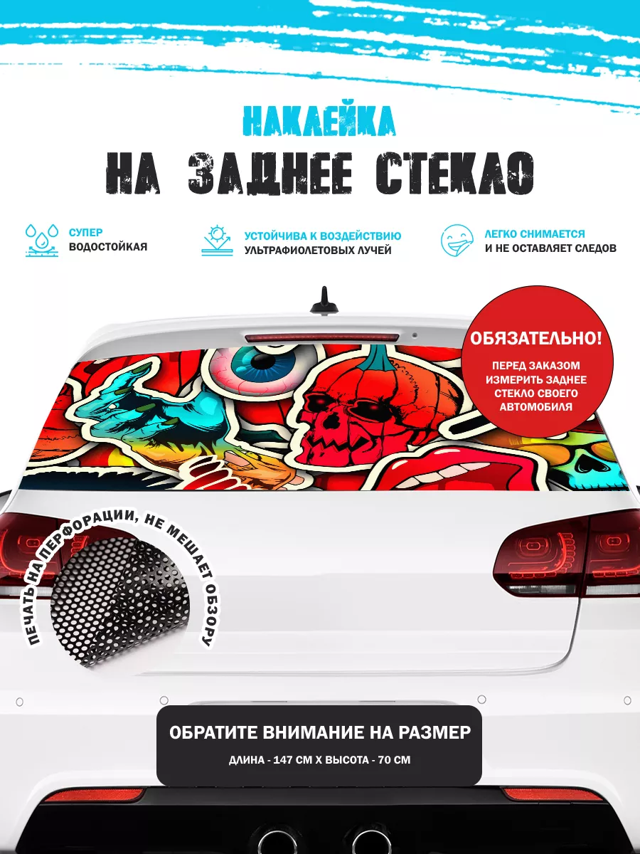 Декоративная наклейка сетка на заднее стекло автомобиля размером 150×70 см предназначена для стилизации и защиты зоны стекла. Перфорированная самоклеящаяся виниловая пленка ПВХ устойчива к мытью, пыли и агрессивным погодным условиям, не выгорает на солнце и легко снимается без следов. В коллекции представлены варианты с надписями, героями кино, аниме, животными и прочими мотивами. Товар упаковывается в защитную тубу для сохранности во время доставки.