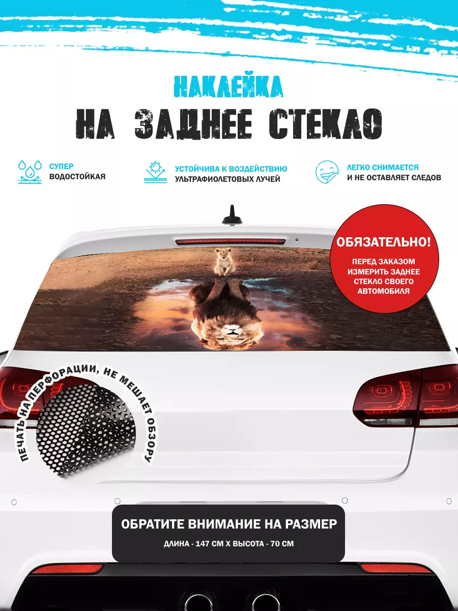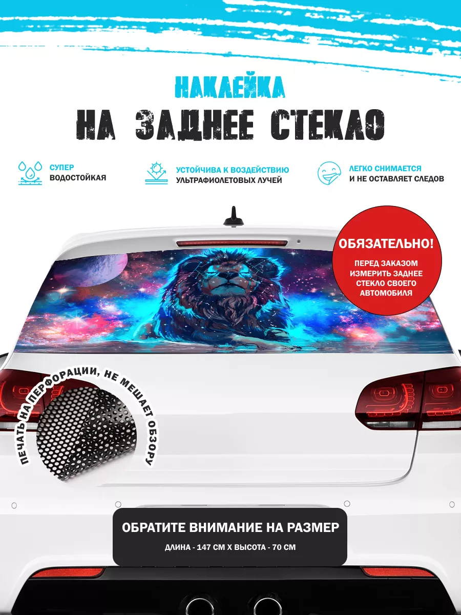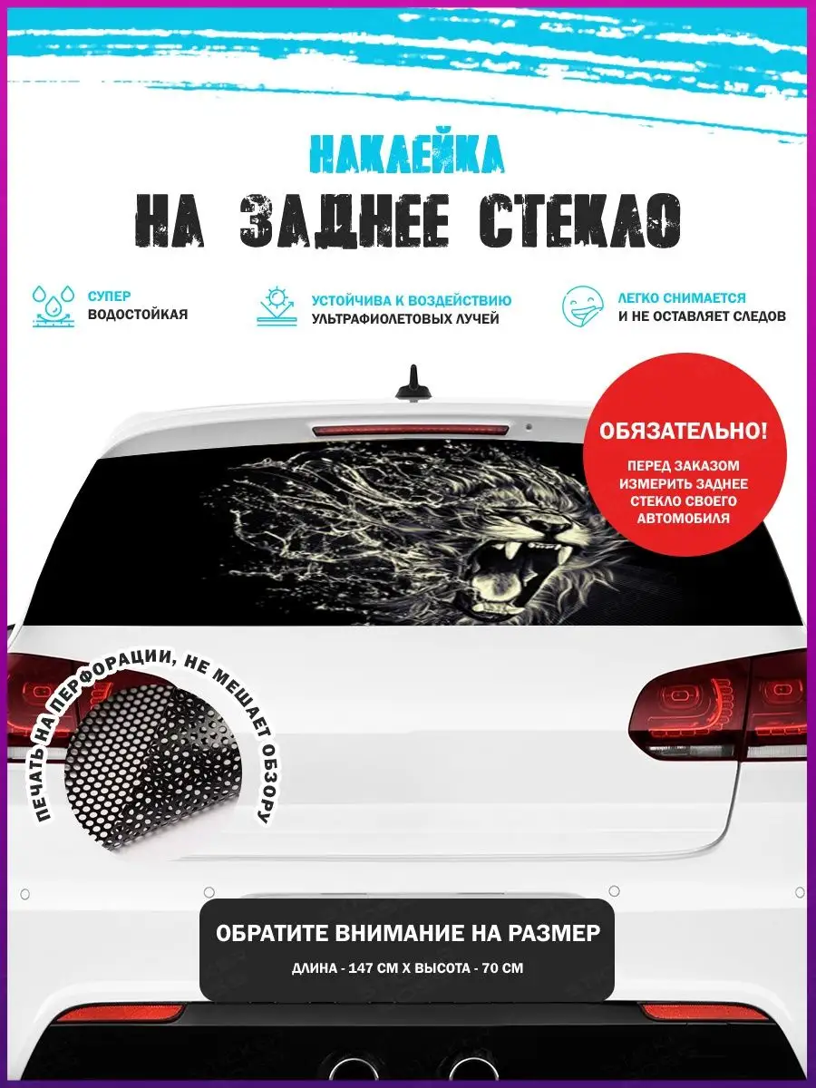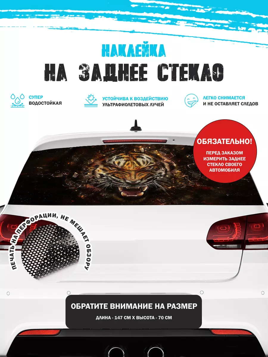 Большая декоративная наклейка на заднее стекло автомобиля выполнена из самоклеящейся виниловой пленки ПВХ с перфорацией. Размер 150x70 см подходит для большинства седанов, хэтчбеков и универсалов. При необходимости можно подрезать лист под нужный размер. Пленка устойчива к мойке, агрессивным погодным условиям, пыли и влаге, не выгорает на солнце. При желании легко снимается без следов.