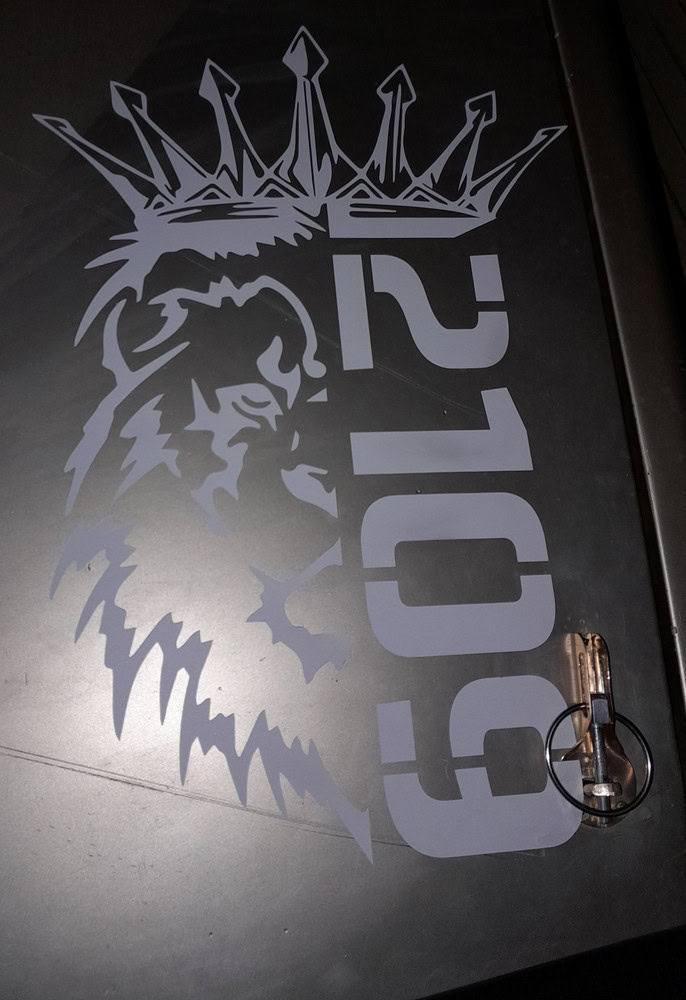 Дизайн выполнен в стилистике, где лев в короне символизирует мощь и благородство. Благодаря качественной самоклеющейся виниловой пленке ПВХ Oracal наклейка сохраняет свой вид под влиянием погодных условий и времени. Текстура и цвет передают чистоту линии и современный характер аксессуара.