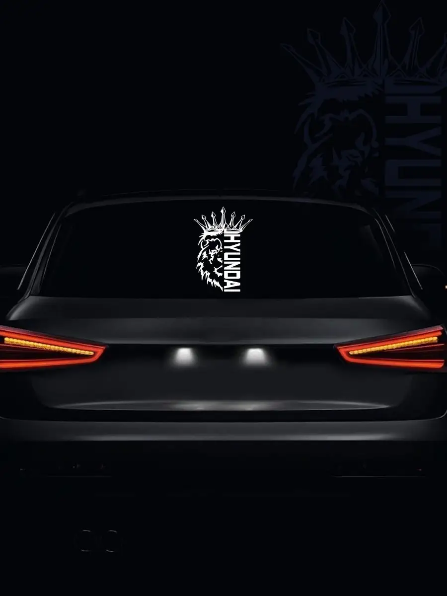 Изображение льва с короной выполнено в выразительной манере, что делает наклейку заметной и стильной. На наклейке слева размещена голова льва, справа — название марки Hyundai, что добавляет акцент и индивидуальность дизайну. Цвет изделия — белый, что позволяет легко вписать наклейку в любой интерьер авто.