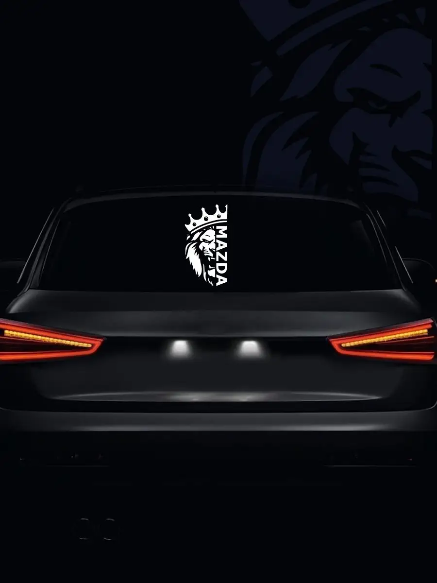 Наклейка на авто лев зубы mazda — декоративное решение для тюнинга автомобиля, которое дополняет образ мощного и уверенного владельца. Изображение головы льва в короне слева и название Mazda справа создают контраст и узнаваемый дизайн.