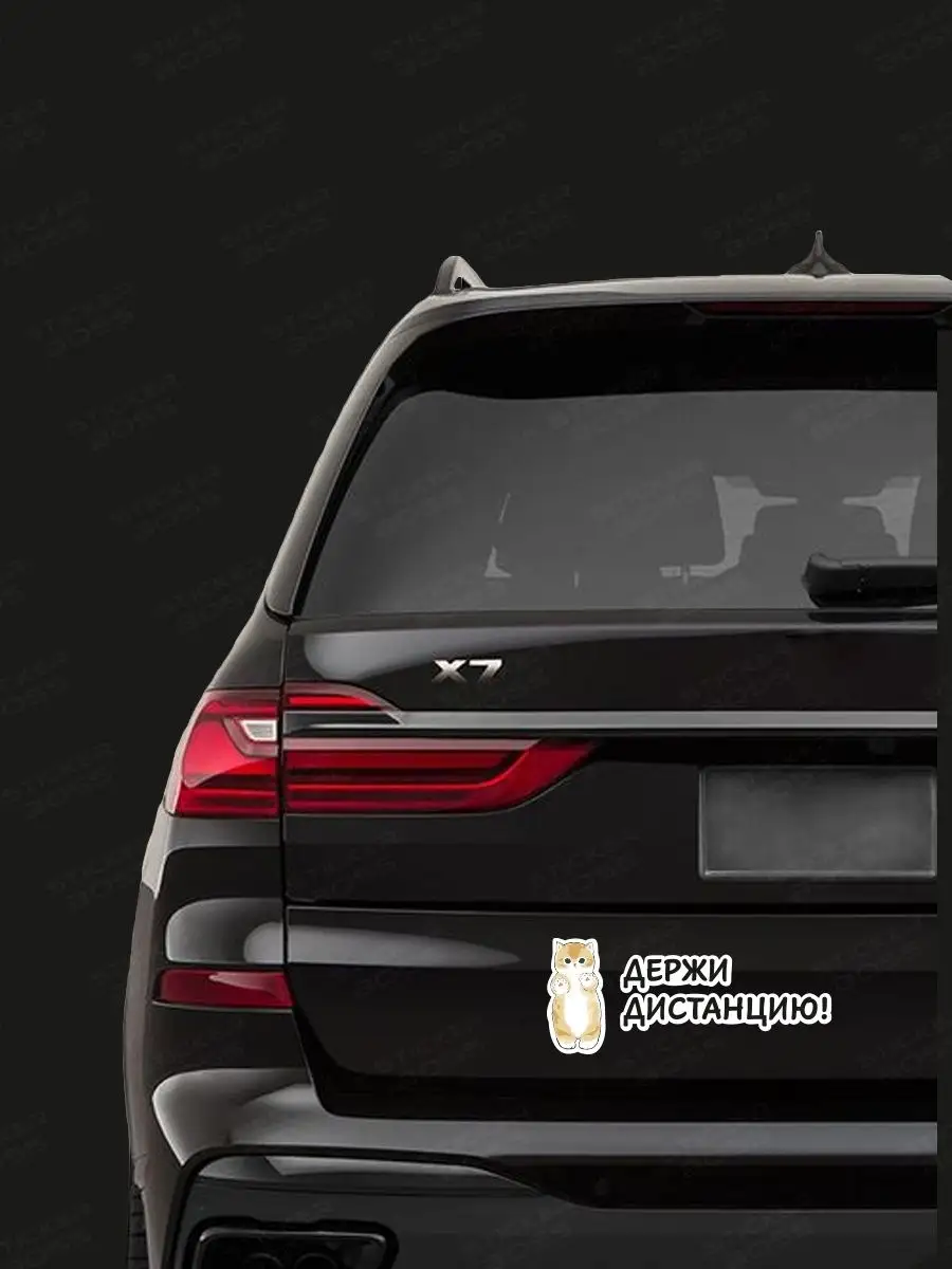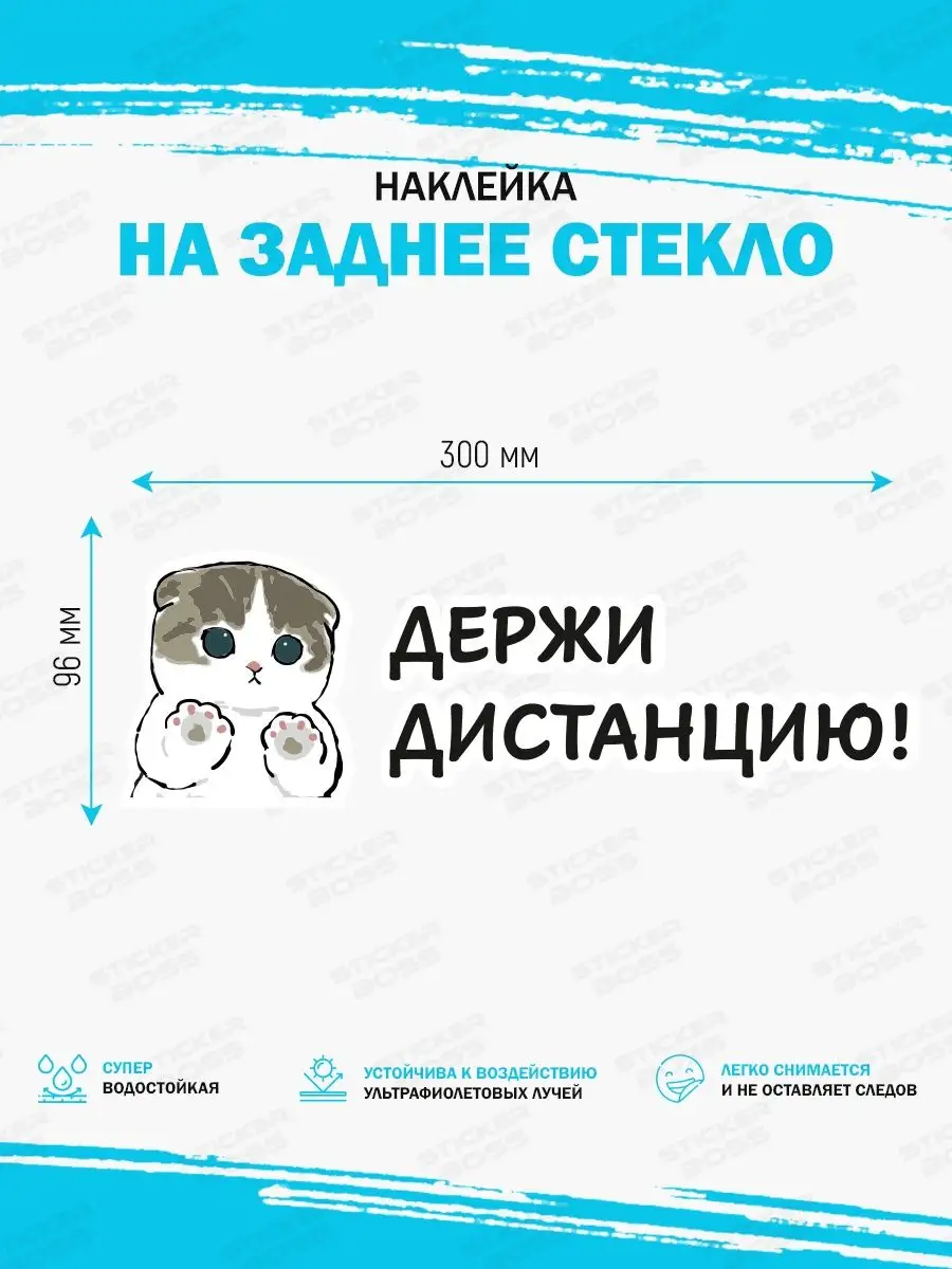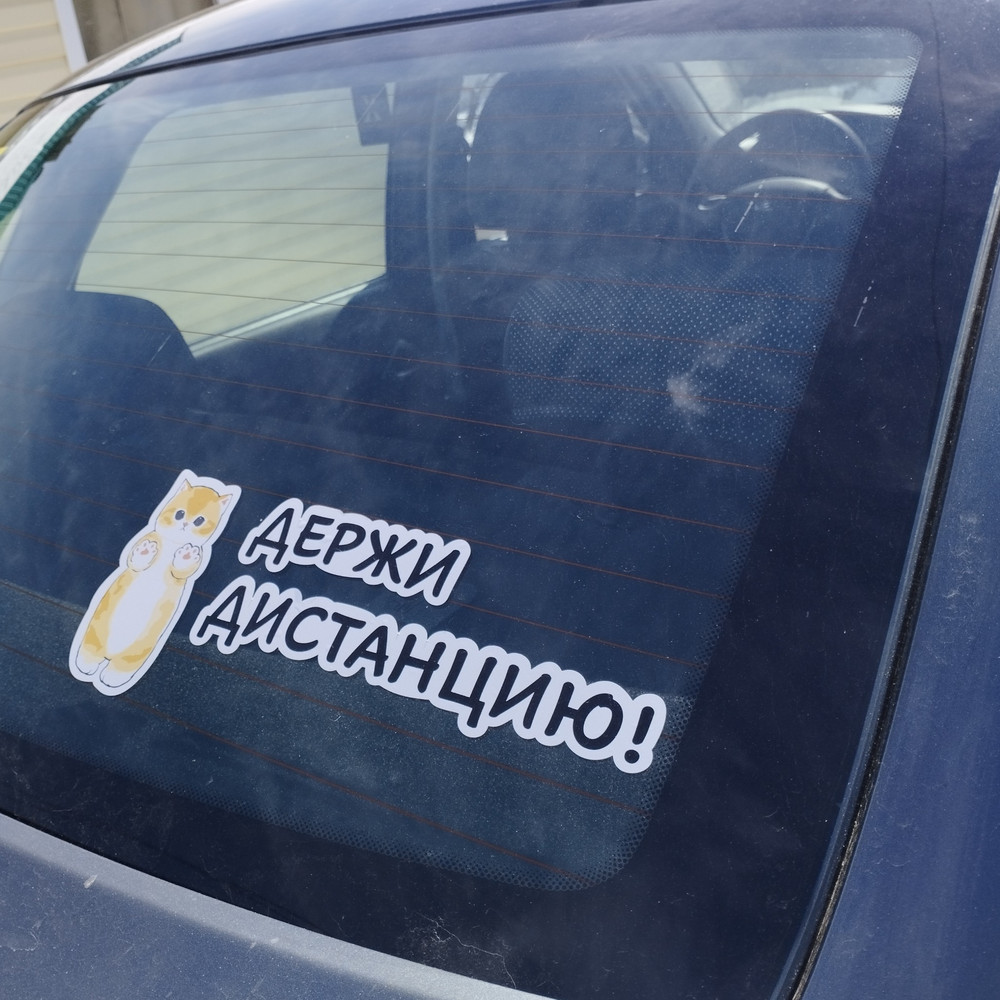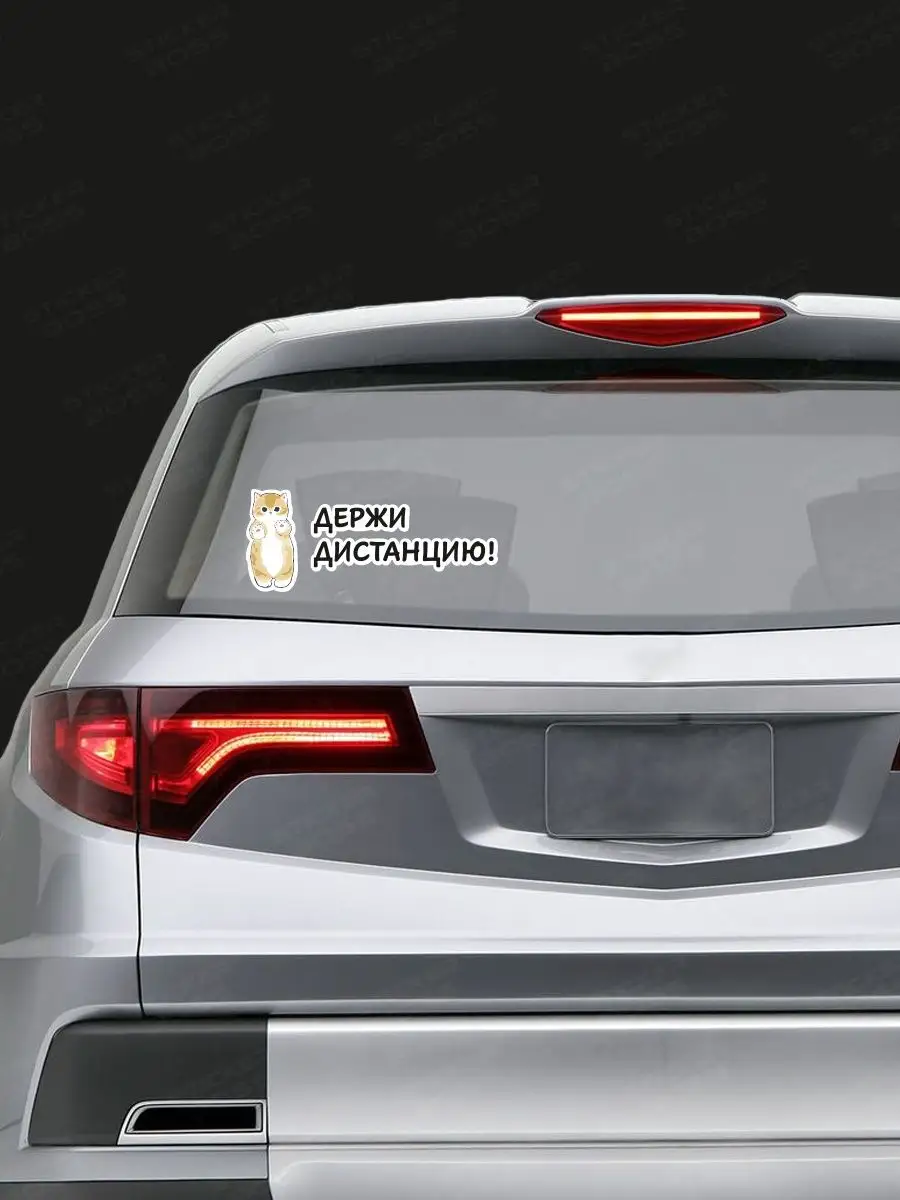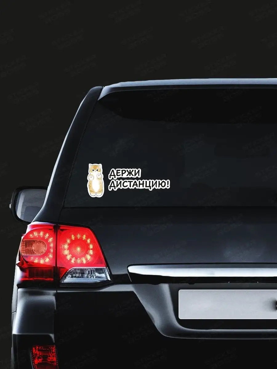 Эта наклейка для автомобиля сочетает декоративность и полезную функцию напоминания о соблюдении безопасной дистанции. Яркий котик и надпись держи дистанцию делают сообщение заметным на дороге и дружелюбным по отношению к другим водителям.