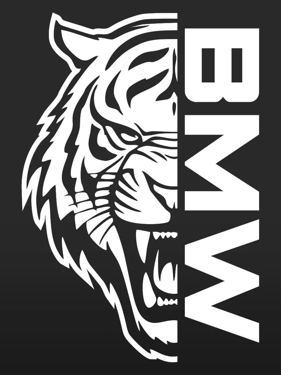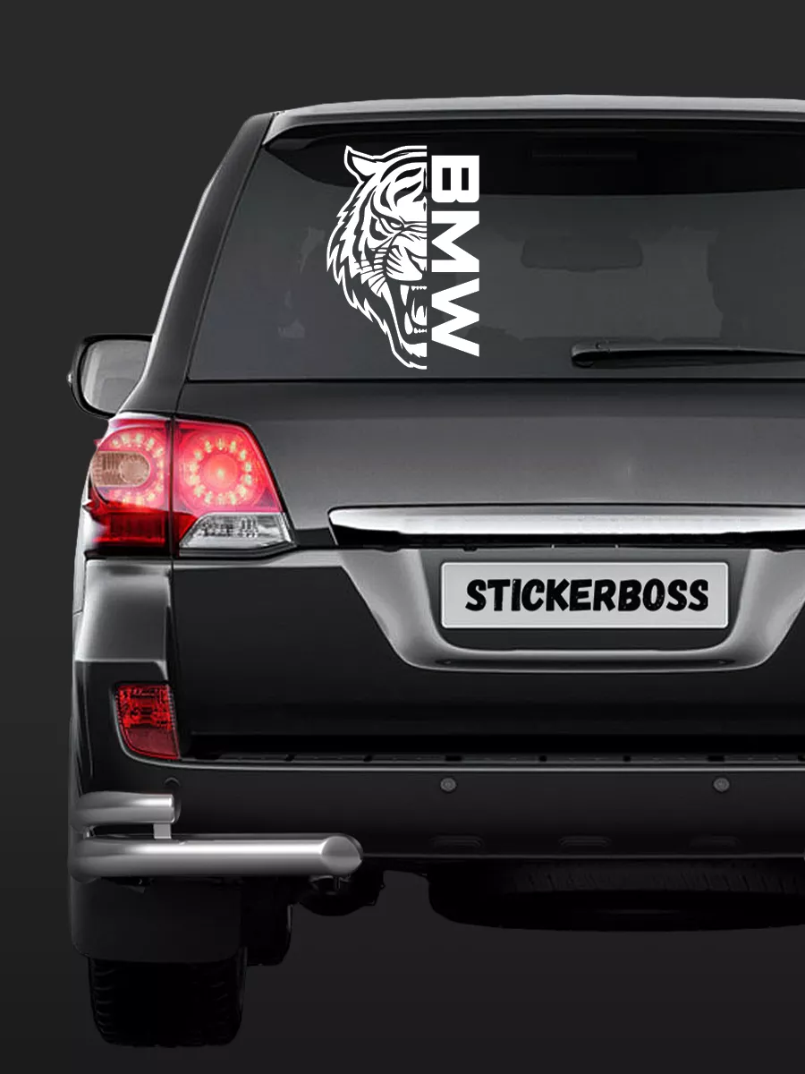 Наклейка на авто тигр BMW белый винил 37x47 см для капота или кузова снаружи — оригинальный элемент тюнинга Stickerboss. Изображение тигриного оскала и стилизованное название марки создают мощный и индивидуальный образ автомобиля.