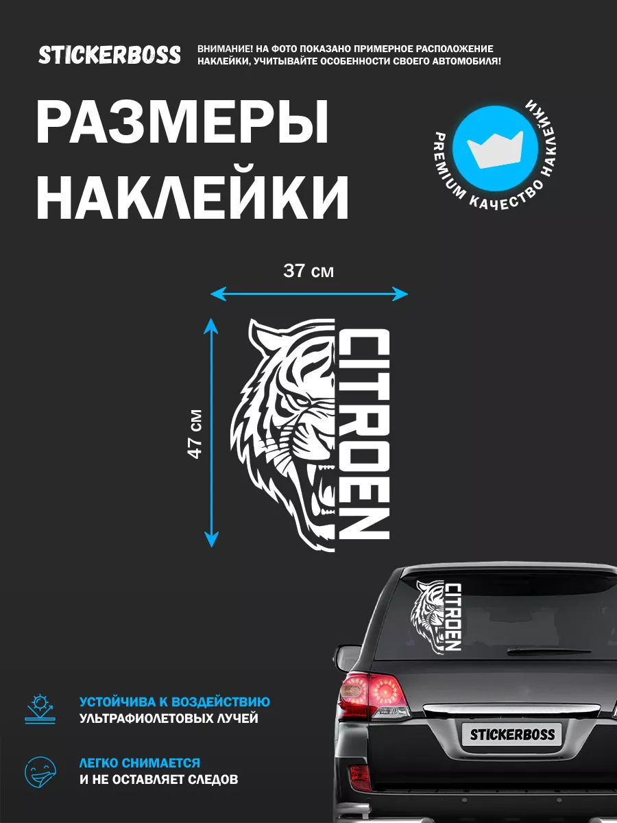 Премиальная наклейка Stickerboss для внешнего тюнинга автомобиля обеспечивает выразительный стиль и характер вашего авто. Яркий тигр с раскрытым взглядом на одной стороне сочетается с названием марки на другой и превращает машину в запоминающийся образ.
