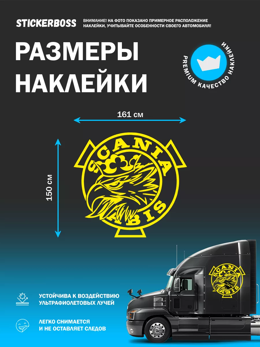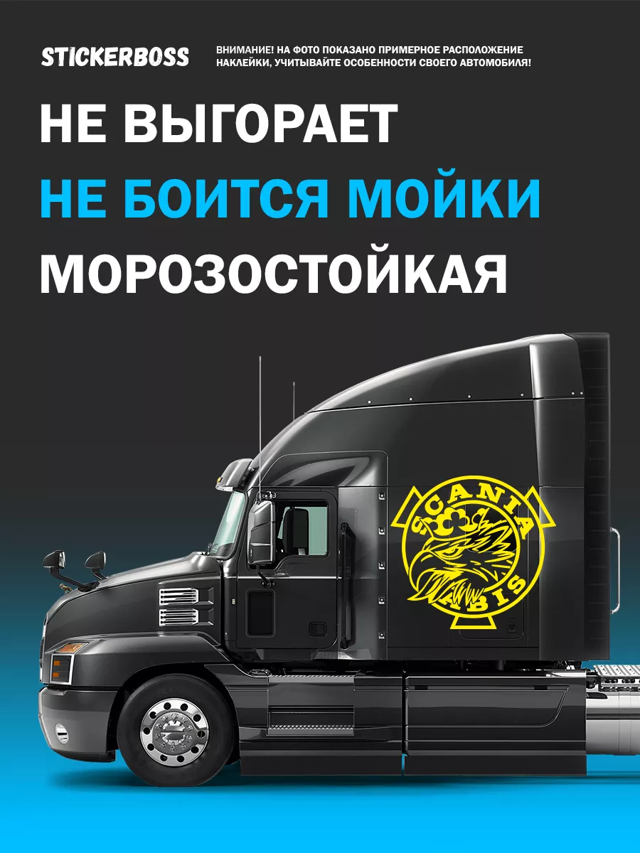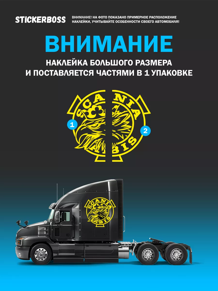 Крупный размер и качественная печать обеспечивают чёткое отображение изображения даже на большом участке кузова. Наклейка рассчитана на размещение на обеих сторонах фуры; есть варианты для левой и правой стороны отдельно. Поставляется в комплекте как наклейка 1 шт. и отличается высокой стойкостью клеевого слоя и материалов.