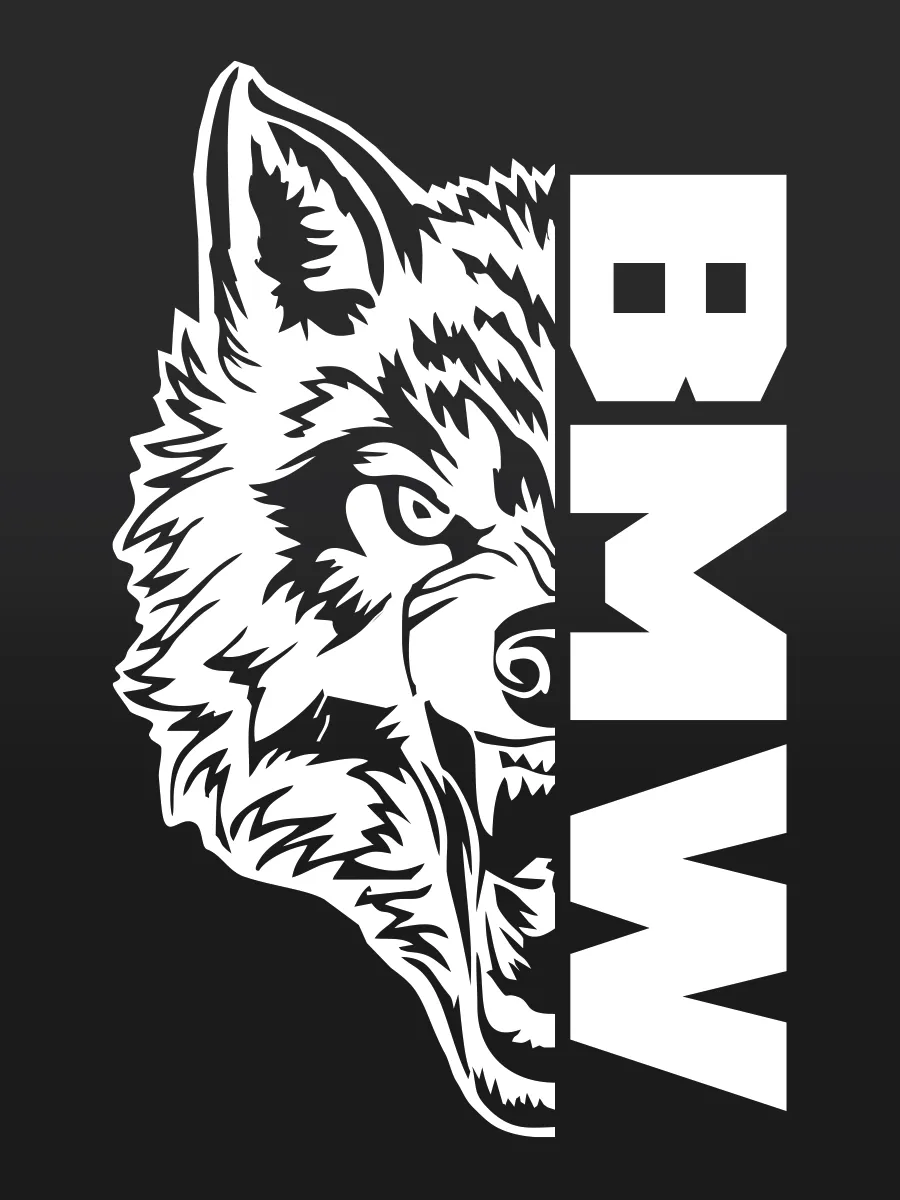 - Изображение волка и название марки BMW интегрированы в дизайн
