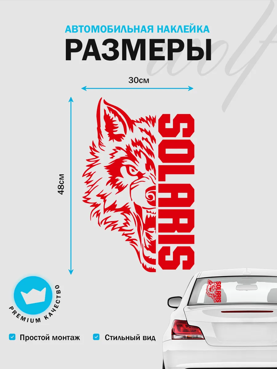 Наклейка на авто волк SOLARIS — стильный акцент на вашем автомобиле, выполненный в красном цвете на прочной виниловой пленке. Привлекает внимание и подчеркивает индивидуальность водителя, сочетаясь с городским и спортивным стилем. Наклейка рассчитана на нанесение на капот или кузов и легко наносится своими силами.