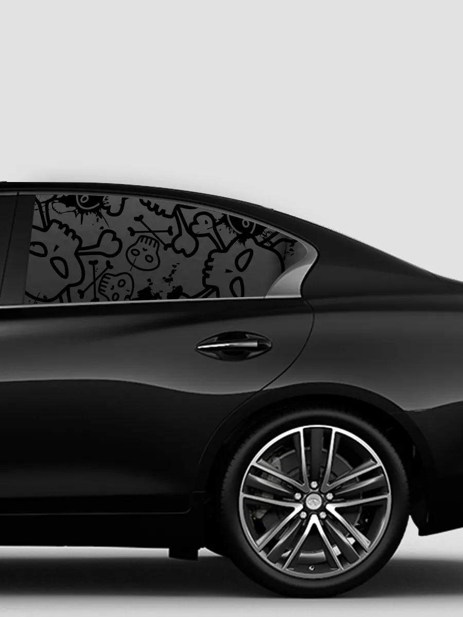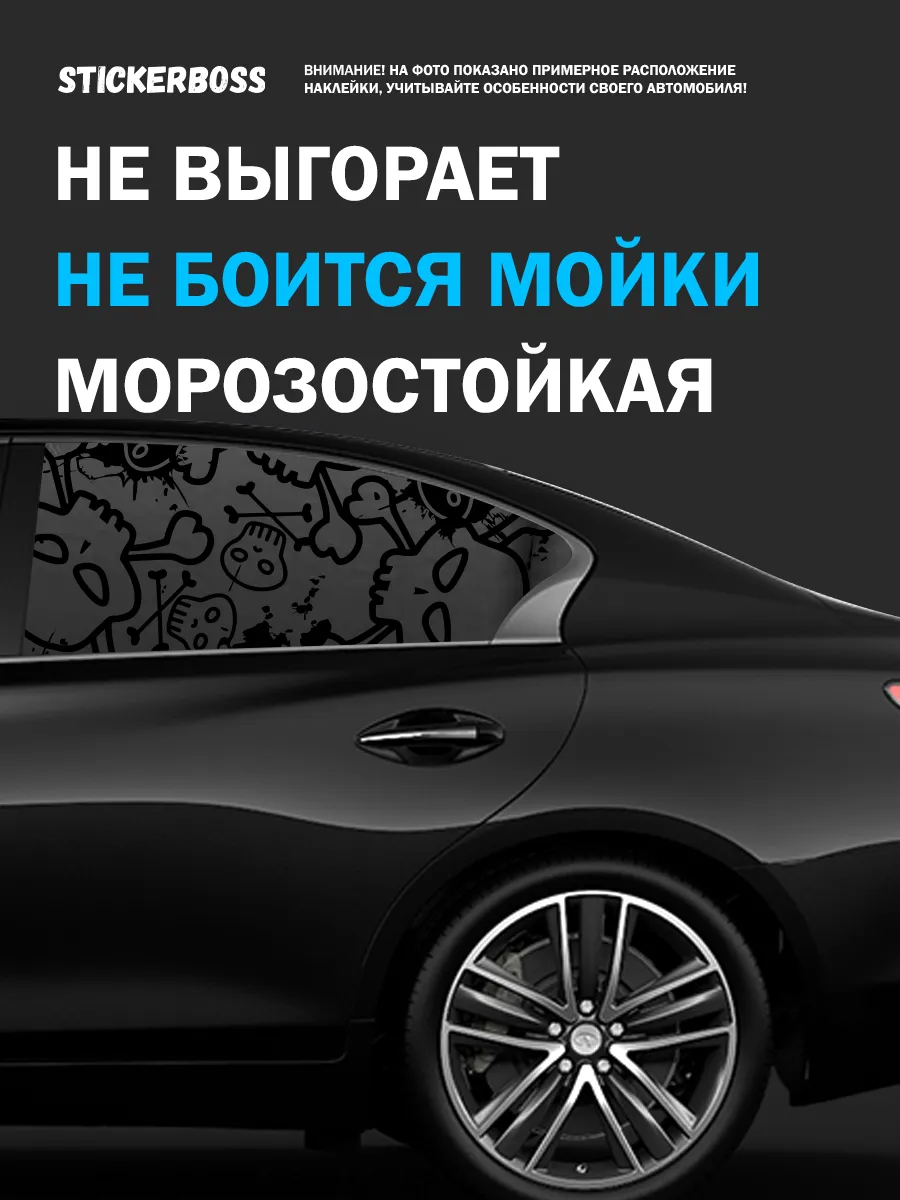 Подходит для боковых стекол большинства легковых автомобилей. Рисунок черепа добавляет индивидуальности и не перегружает общий стиль автомобиля.