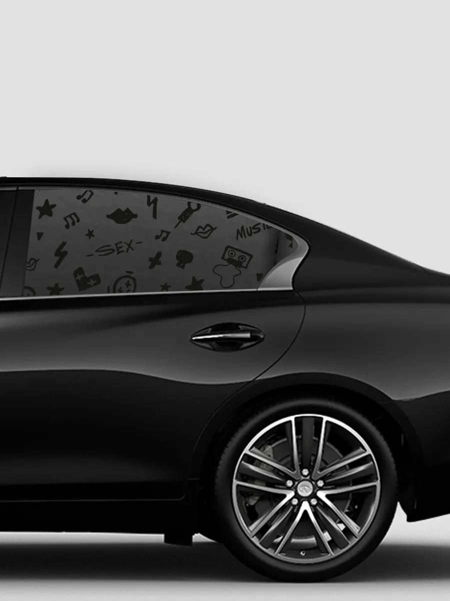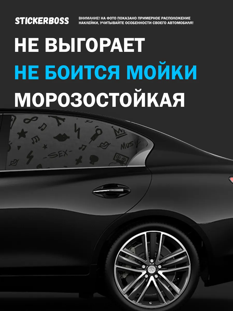 Эти наклейки предназначены для бокового стекла автомобиля. Они подходят к любым вариантам окраски кузова и не мешают работе тонировки, а также позволяют менять образ машины без вмешательства в стекла.