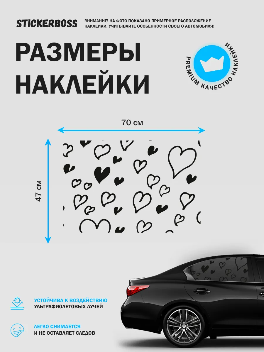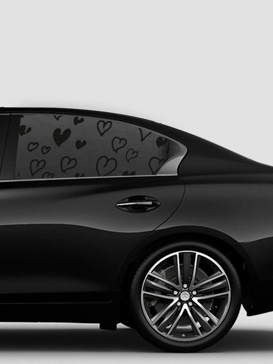 Черная матовая наклейка на боковое стекло добавляет автомобилю стильный и современный вид. Благодаря повторяющемуся паттерну сердечки наклейка подчеркивает индивидуальность транспортного средства и гармонично сочетается с любыми тонировками.