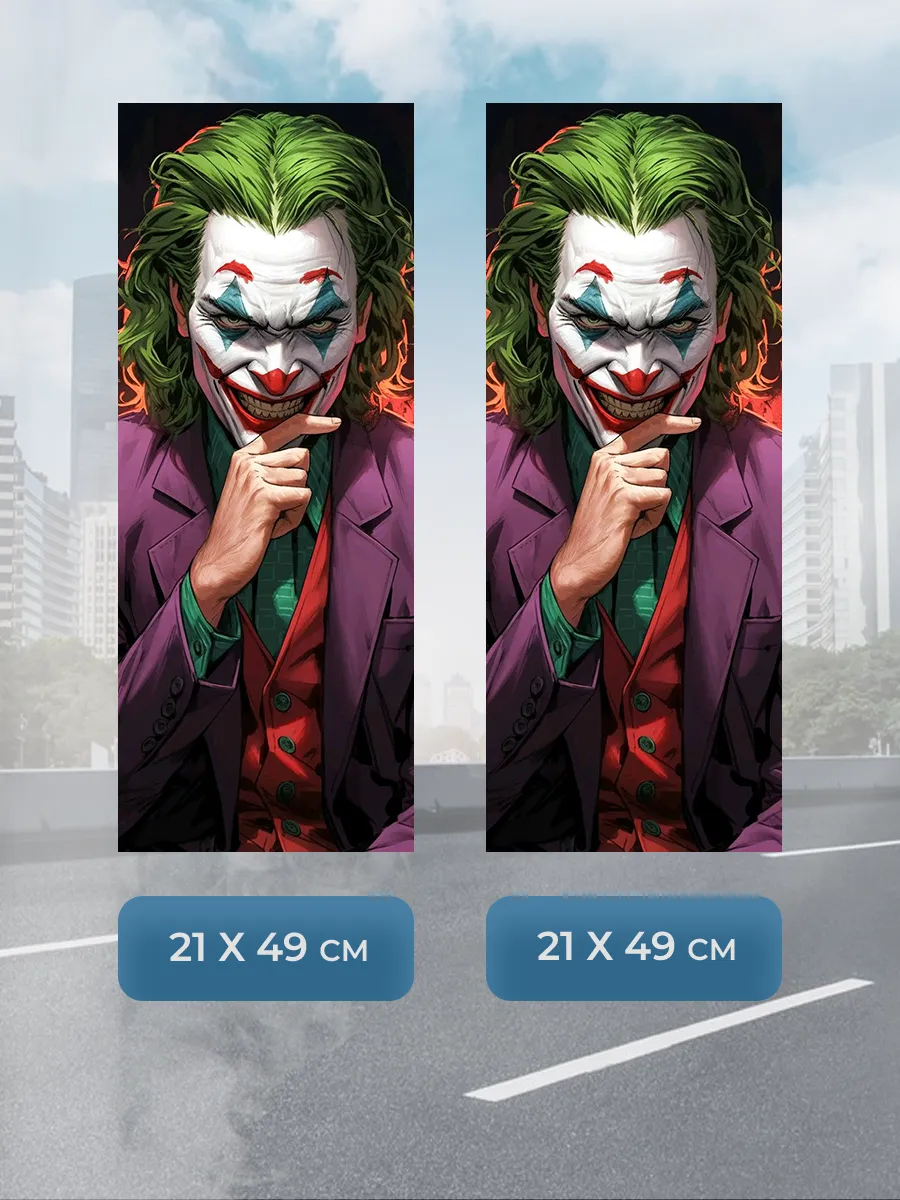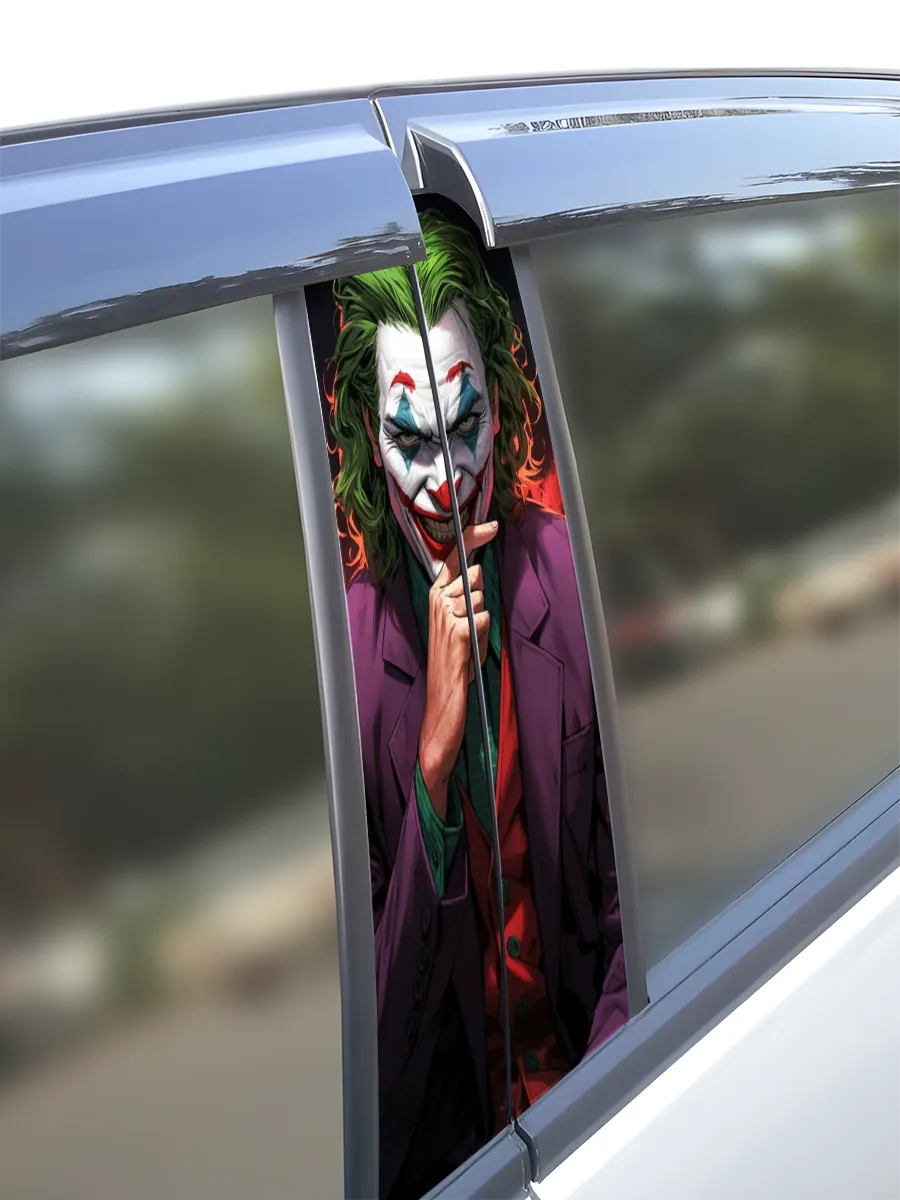 Наклейка на боковые стойки авто 21х49 см 2 шт. Джокер — стильное дополнение к кузову, которое подчеркивает индивидуальность и привлекает внимание на дороге. Комплект включает две наклейки для обеих сторон автомобиля и выполнен из прочной самоклеящейся пленки ПВХ Oracal.