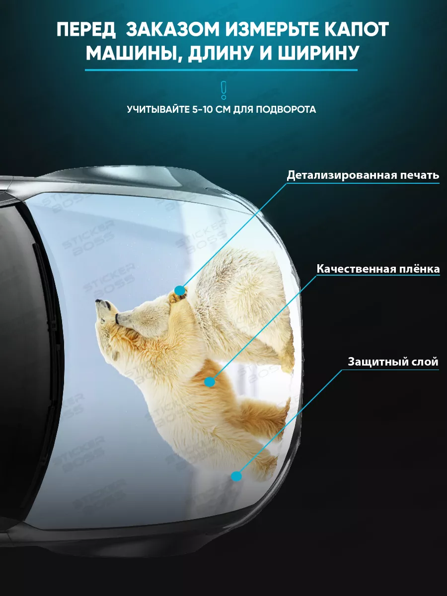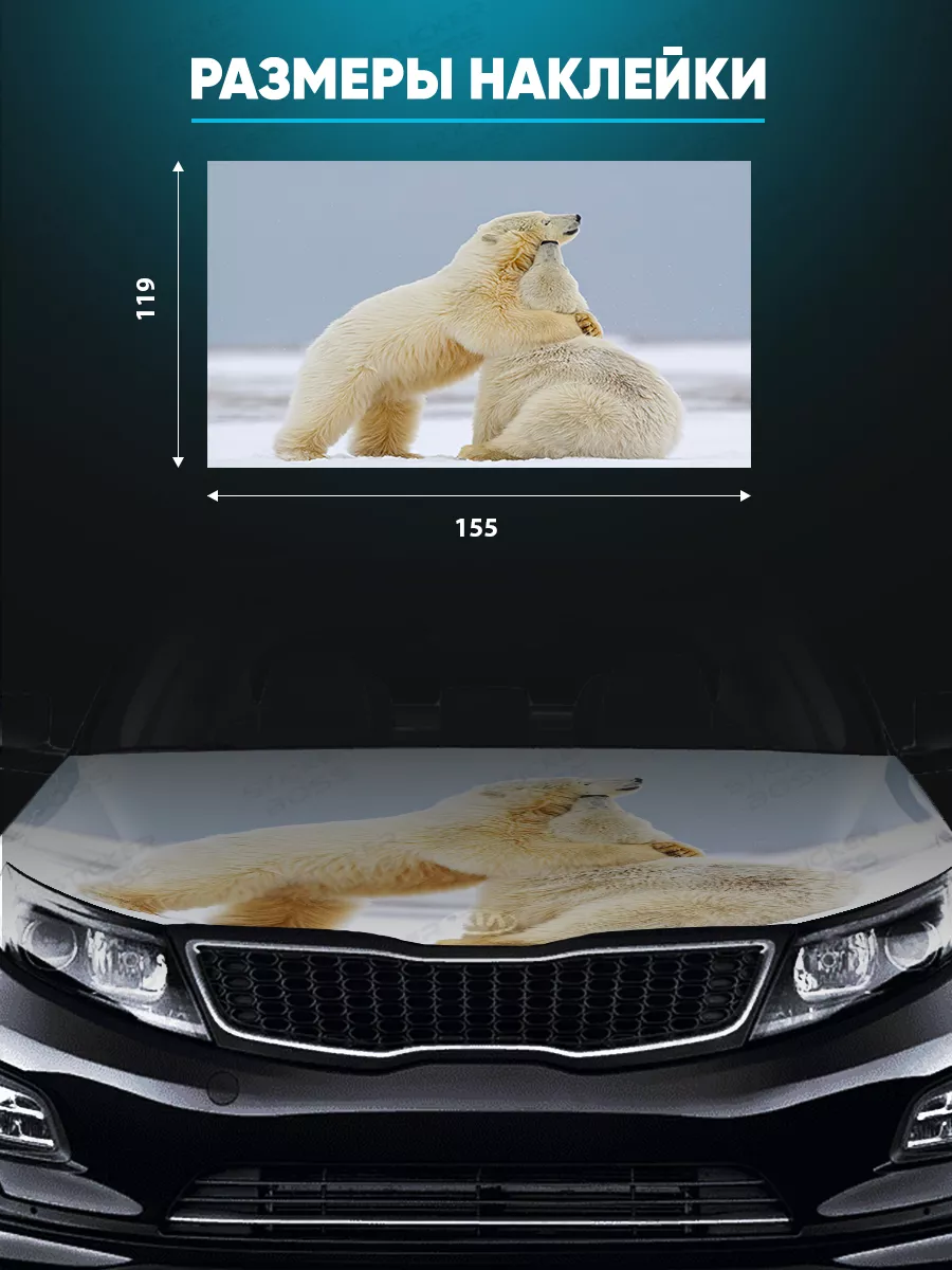 Большая декоративная наклейка на капот автомобиля размером 155х119 см. Универсальная по форме и дизайну, подходит для большинства седанов, хэтчбеков и универсалов. В коллекции есть варианты с белыми медведями, животными, аниме, флагами, горами и пейзажами; можно подобрать под стиль машины.