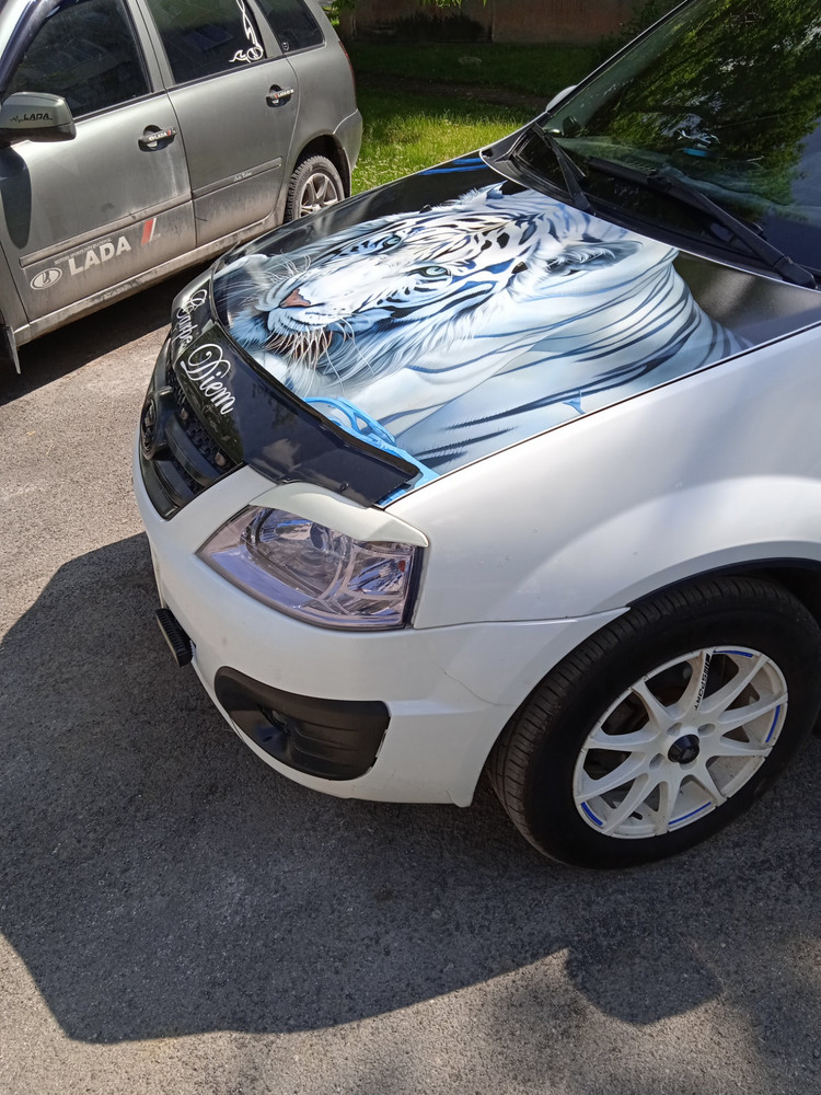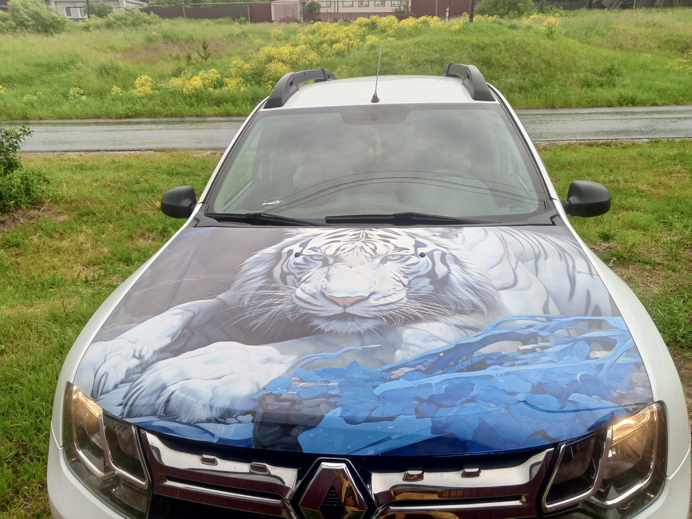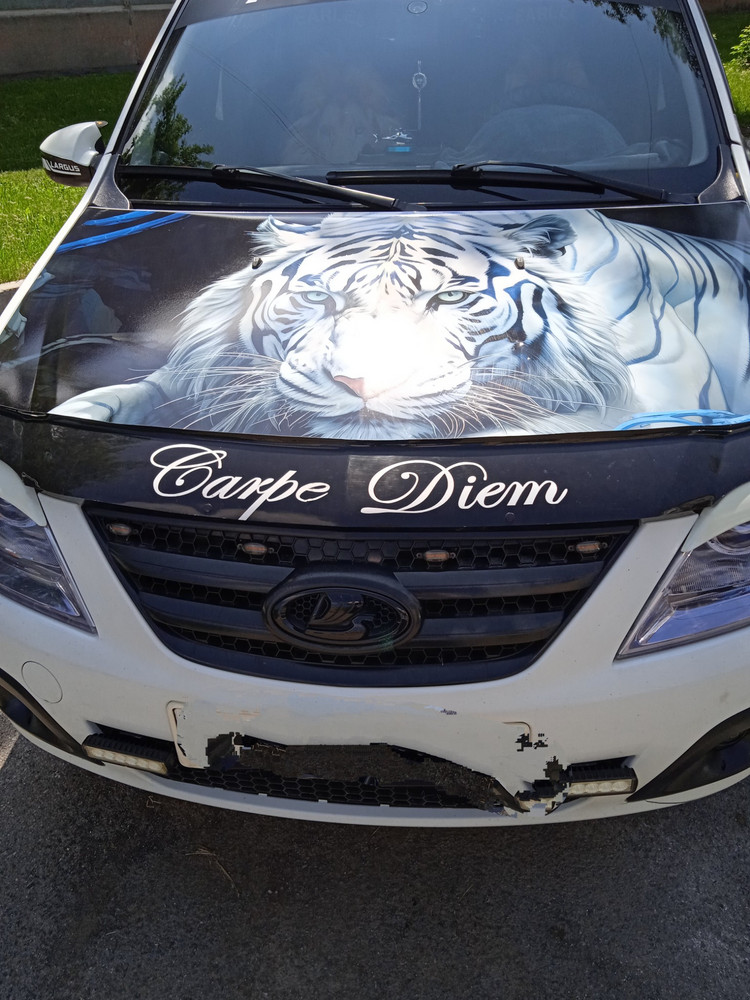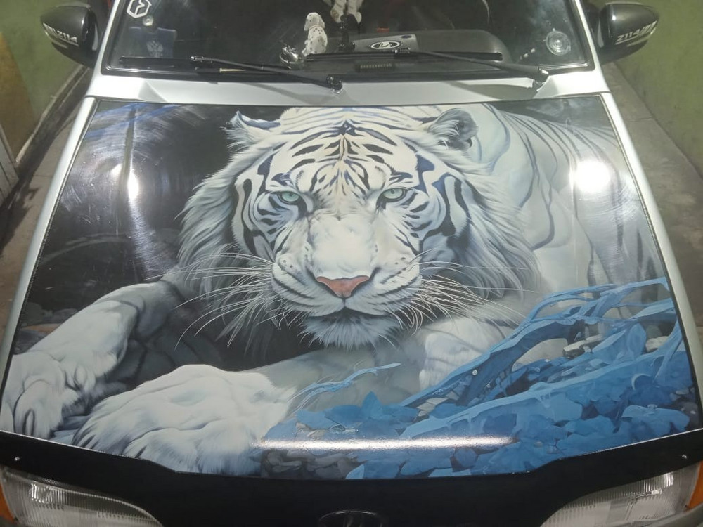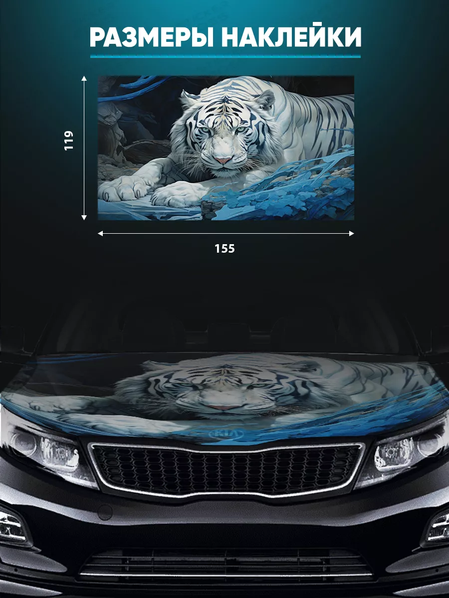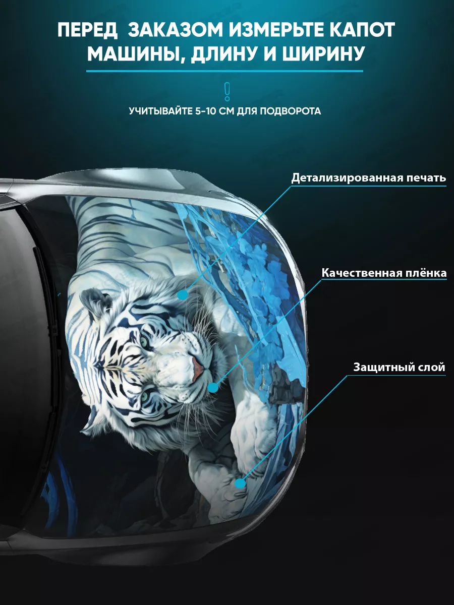 Большая декоративная наклейка на капот автомобиля размером 155x119 см, которая добавляет выразительный стиль и индивидуальность. В коллекции Stickerboss представлены варианты с надписями, изображениями животных, аниме-стили, флаги, горы, города и пейзажи, включая вариант с белым тигром.