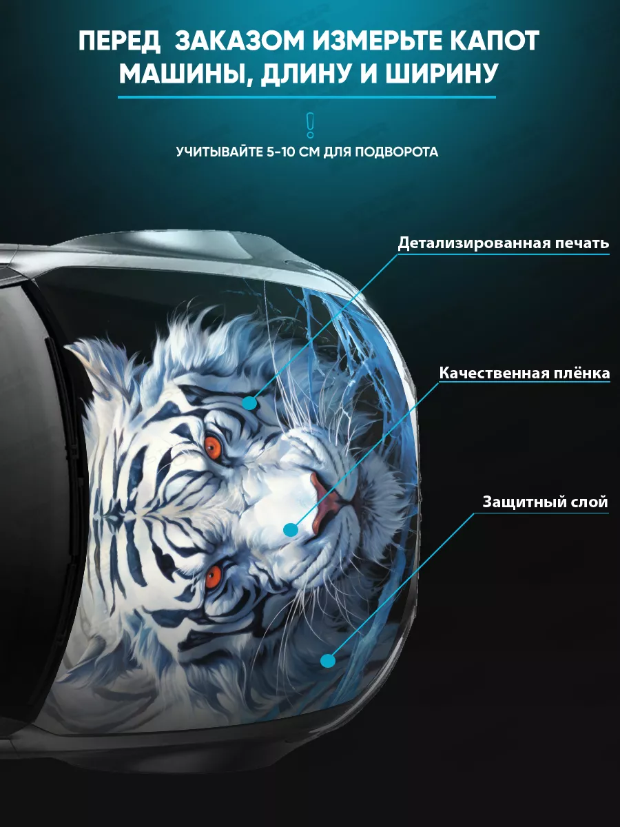 Коллекция включает принты с надписями, героями известных фильмов, динамичные изображения львов, тигров и др., а также мотивы в стиле аниме, флаги России, города, пейзажи и многое другое. Наклейка подходит для капотов большинства популярных авто.