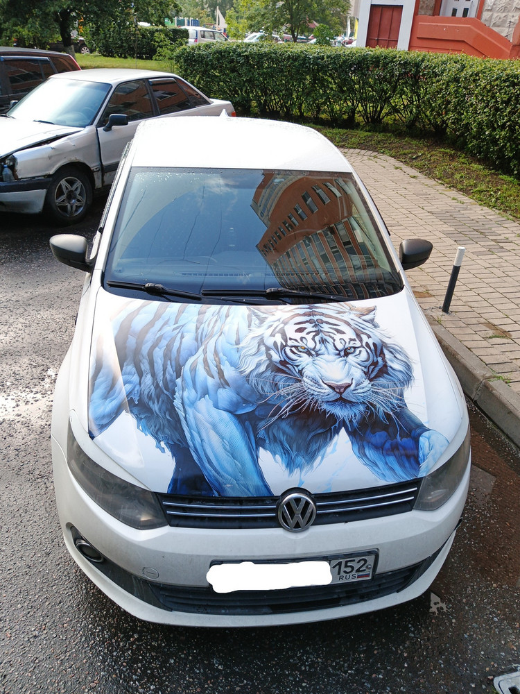 Очищенную поверхность капота подготавливайте к наклейке. Снимите защитную подложку, разместите наклейку и плавно пригладьте, удаляя пузырьки воздуха. При необходимости можно подрезать края под форму капота.