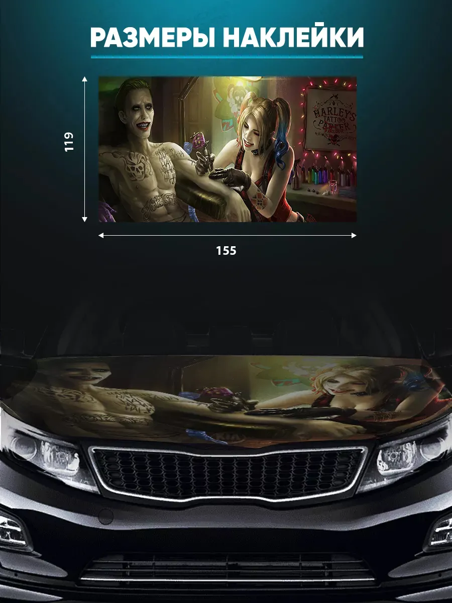 Наклейка на капот авто 155х119 см Джокер и Харли — крупное декоративное решение для стильной индивидуальности вашего автомобиля. Изготовлена на качественной самоклеящейся виниловой пленке ПВХ с верхним слоем ламинации, что обеспечивает долговечность, стойкость к мытью и неблагоприятным условиям. При необходимости легко подрезать лист под нужный размер. Товар упаковывается в защитную тубу, чтобы сохранить яркость красок во время доставки. В коллекции множество вариантов на любой вкус: персонажи из фильмов, животные, аниме-стиль, флаги, горы и города.