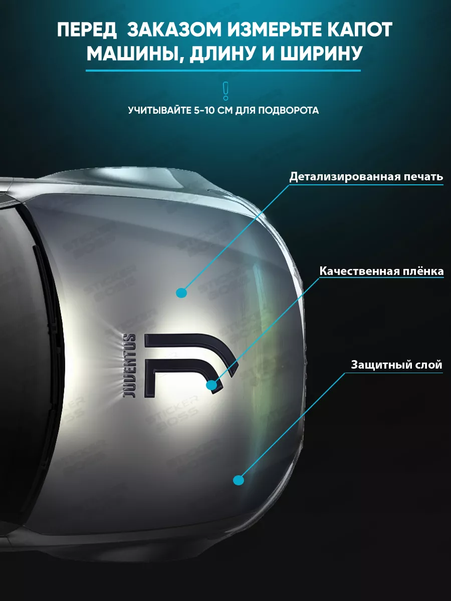 - Размер стикера: 155х119 см, универсальная посадка на капот большинства авто (седан, хэтчбек, универсал).