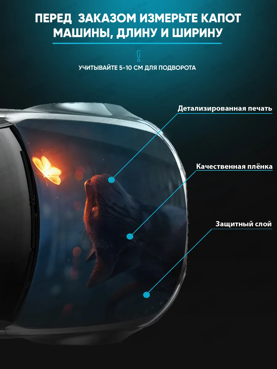 Эта наклейка на капот сочетает декоративный эффект с практичностью. Размер 155х119 см обеспечивает заметность на большинстве автомобилей, а универсальность позволяет подогнать стикер под контур капота.