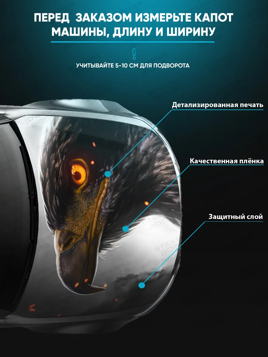 Эта наклейка на капот служит декоративным акцентом и добавляет стилю автомобиля индивидуальность. Ее крупный формат и прочная пленка позволяют сохранить яркость рисунка при повседневной эксплуатации и мойке. Универсальный размер 155х119 см подходит для большинства капотов седанов, хэтчбеков и универсалов; при необходимости можно подрезать лист под нужный размер.