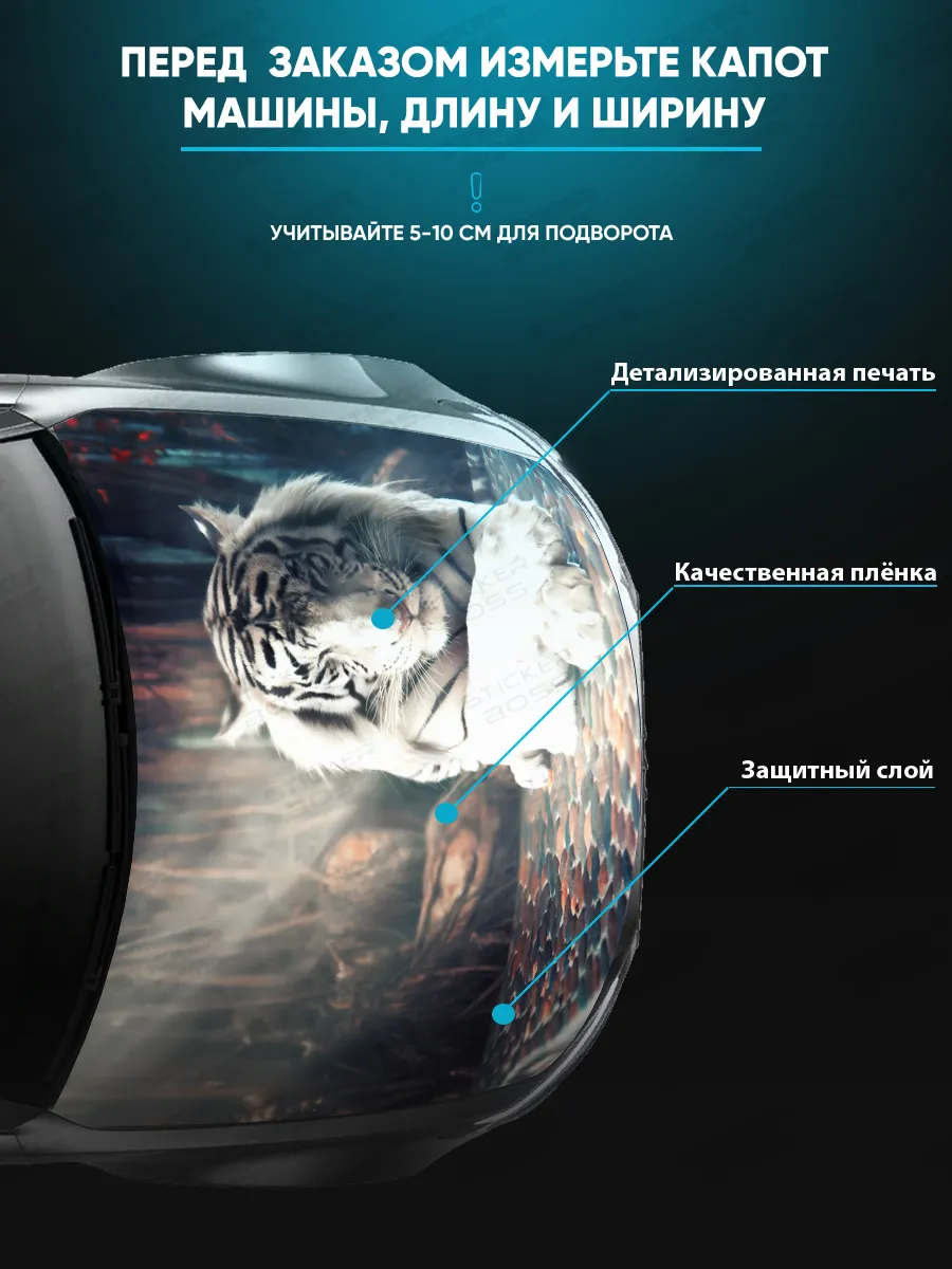Эта наклейка на капот позволяет выразительно подчеркнуть стиль автомобиля и индивидуальность. Она выполнена на основе самоклеящейся виниловой пленки ПВХ и рассчитана на длительную эксплуатацию.
