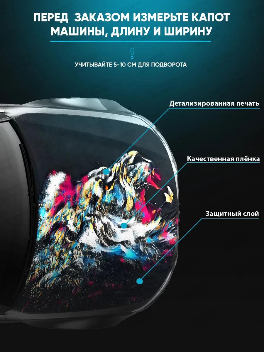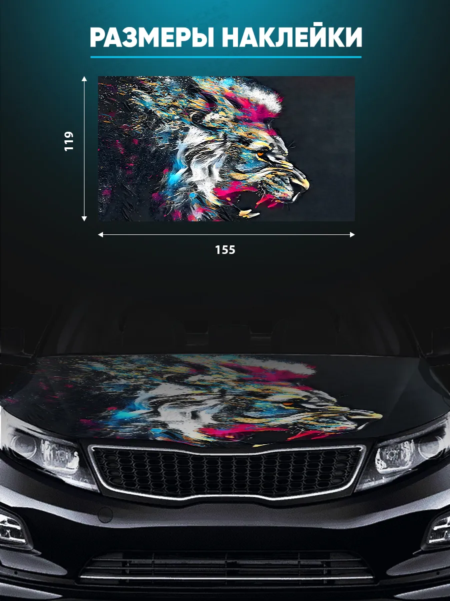 Наша наклейка на капот — крупное декоративное решение для оформления автомобиля. Размер стикера 155х119 см, он универсален и подходит для большинства седанов, хэтчбеков и универсалов. При желании можно подрезать лист под нужный размер.