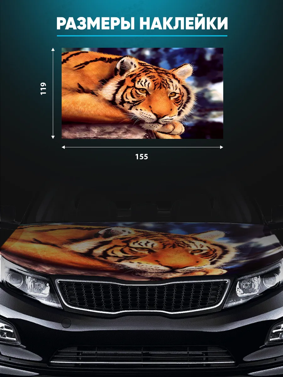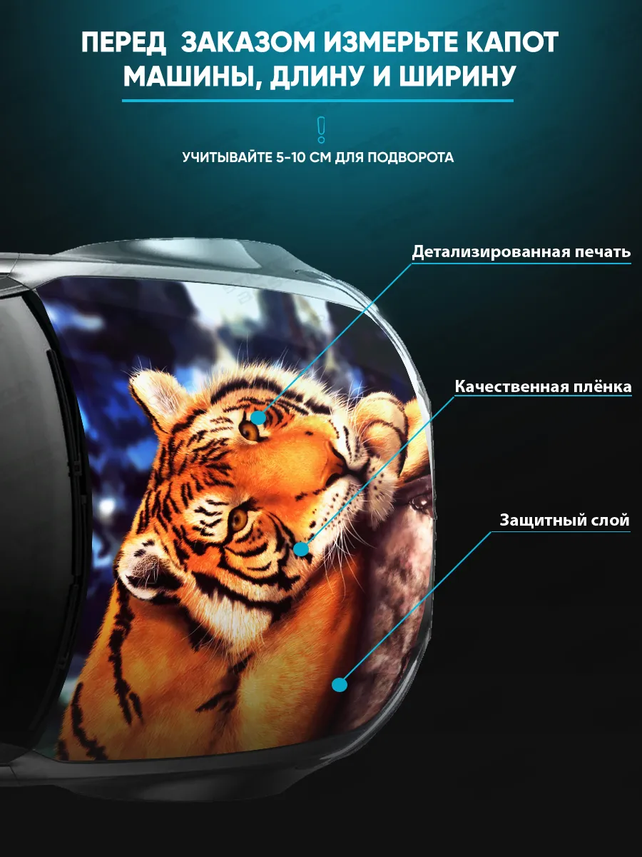 Наклейка позволяет украсить внешний вид капота и подчеркнуть индивидуальность автомобиля. Дизайн с тигром и динамичными элементами подойдет для ценителей ярких обликов.
