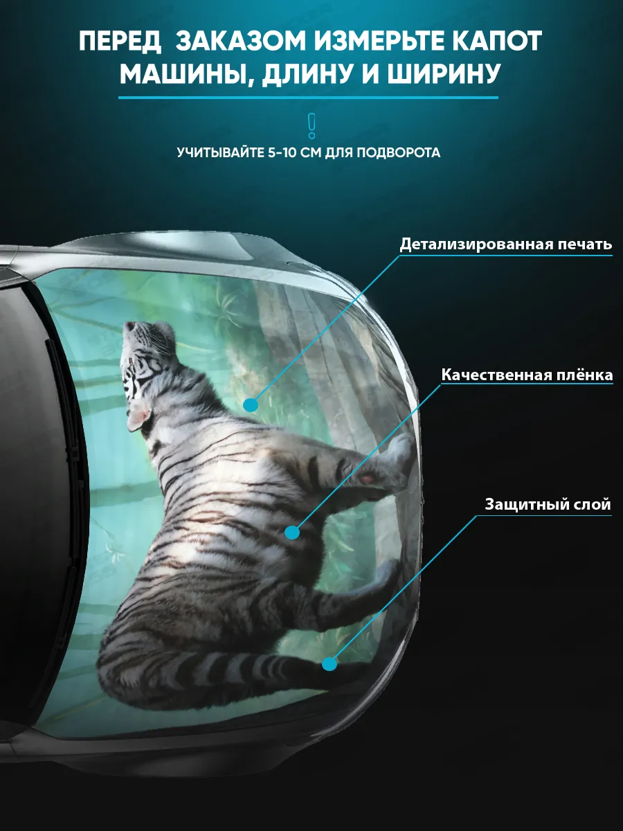 Эта наклейка на капот добавляет автомобилю индивидуальность и стиль. Размер 155x119 см подходит для большинства капотов и легко подрезается по форме, если требуется. Изготовлена на самоклеящейся виниловой пленке ПВХ с дополнительной ламинацией, что обеспечивает прочность изображения и защиту от влаги и ультрафиолета.