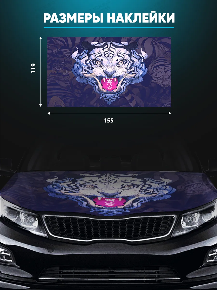 Эта наклейка на капот обеспечивает декоративное оформление автомобиля крупным форматом, создавая выразительный акцент. Размер 155×119 см подходит для большинства седанов, хэтчбеков и универсалов, а при необходимости лист можно подрезать по контуру.