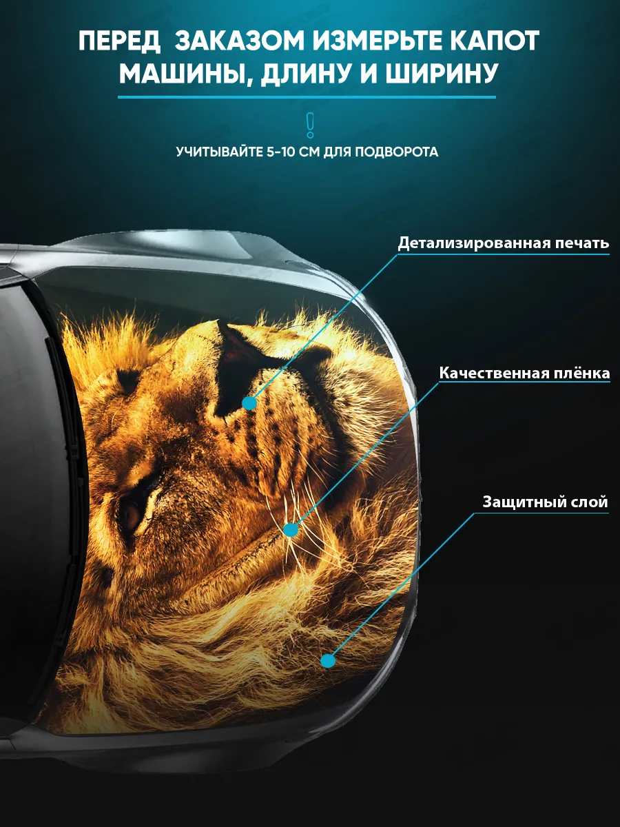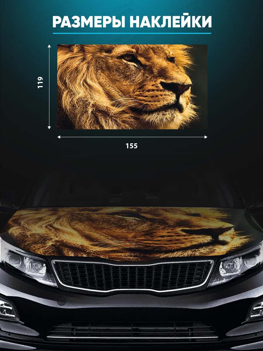 Эта наклейка создана для украшения капота автомобиля, сочетая крупный формат и декоративный рисунок. Размер 155х119 см позволяет разместить дизайн на большинстве моделей кузова. При необходимости можно подрезать лист под нужный размер.