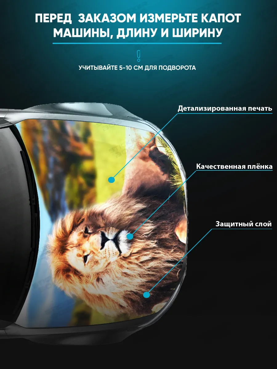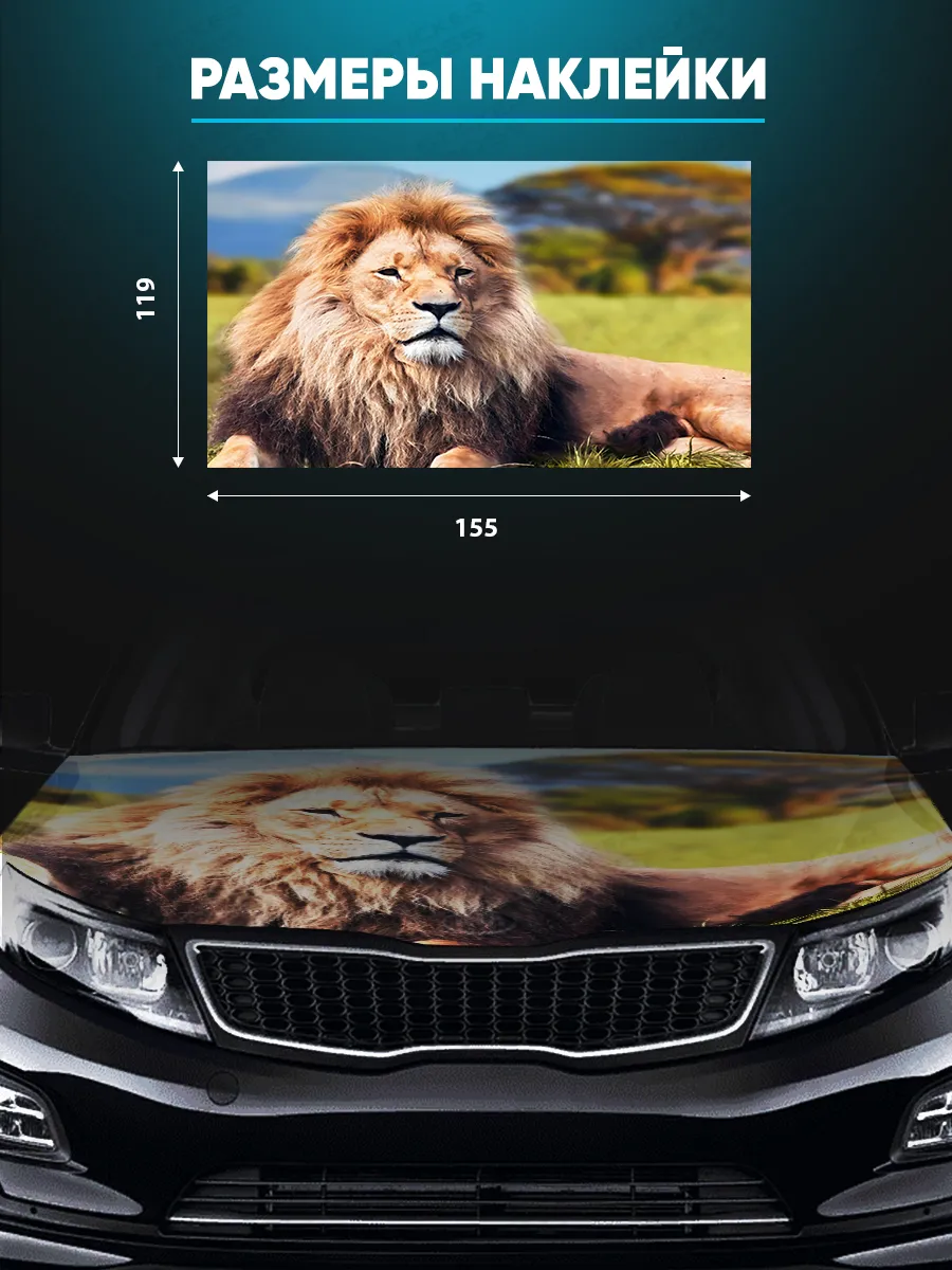 Эта наклейка позволяет украсить капот автомобиля и придать ему индивидуальность. Размер 155х119 см охватывает большую часть капота большинства популярных авто, будь то седан, хэтчбек или универсал. При необходимости можно подрезать лист под нужный размер.