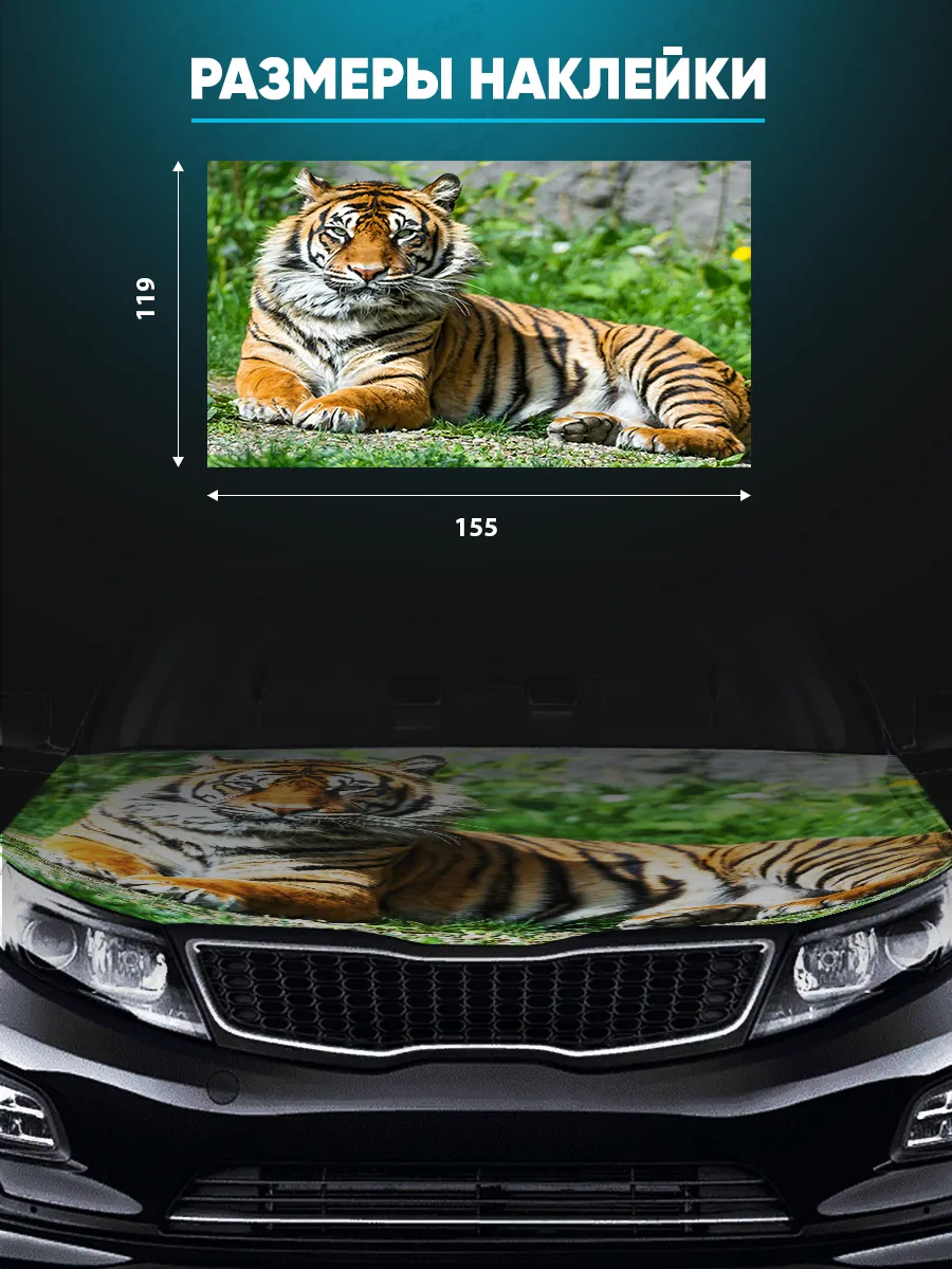 Эта наклейка на капот обеспечивает крупный визуальный эффект и при этом проста в использовании. Размер 155х119 см позволяет покрыть значительную часть поверхности капота, а рисунок тигра (643) привлекает внимание и подчеркивает стиль автомобиля.