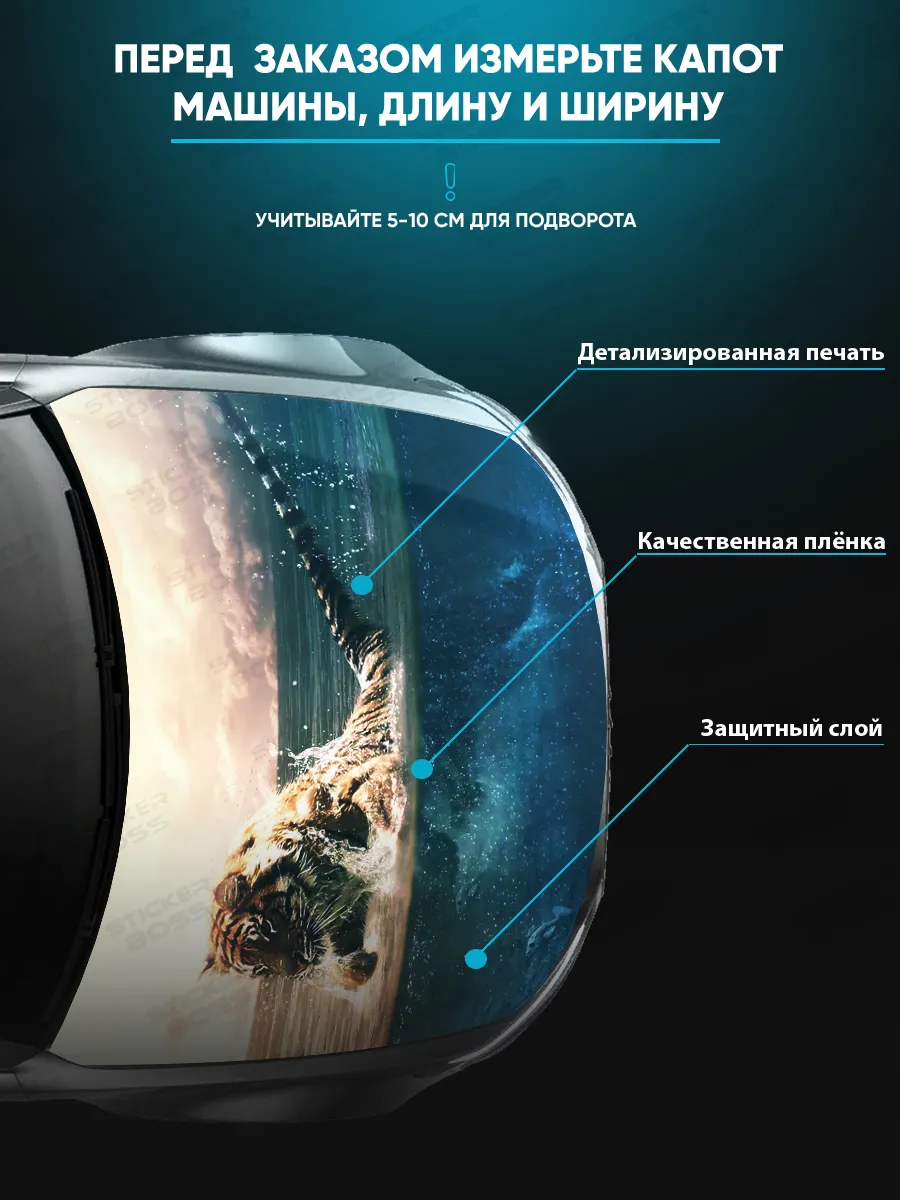 Подробнее о применении: данная наклейка предназначена для внешнего декора капота автомобиля. Ее можно подрезать по размеру и приклеить на чистую ровную поверхность.
