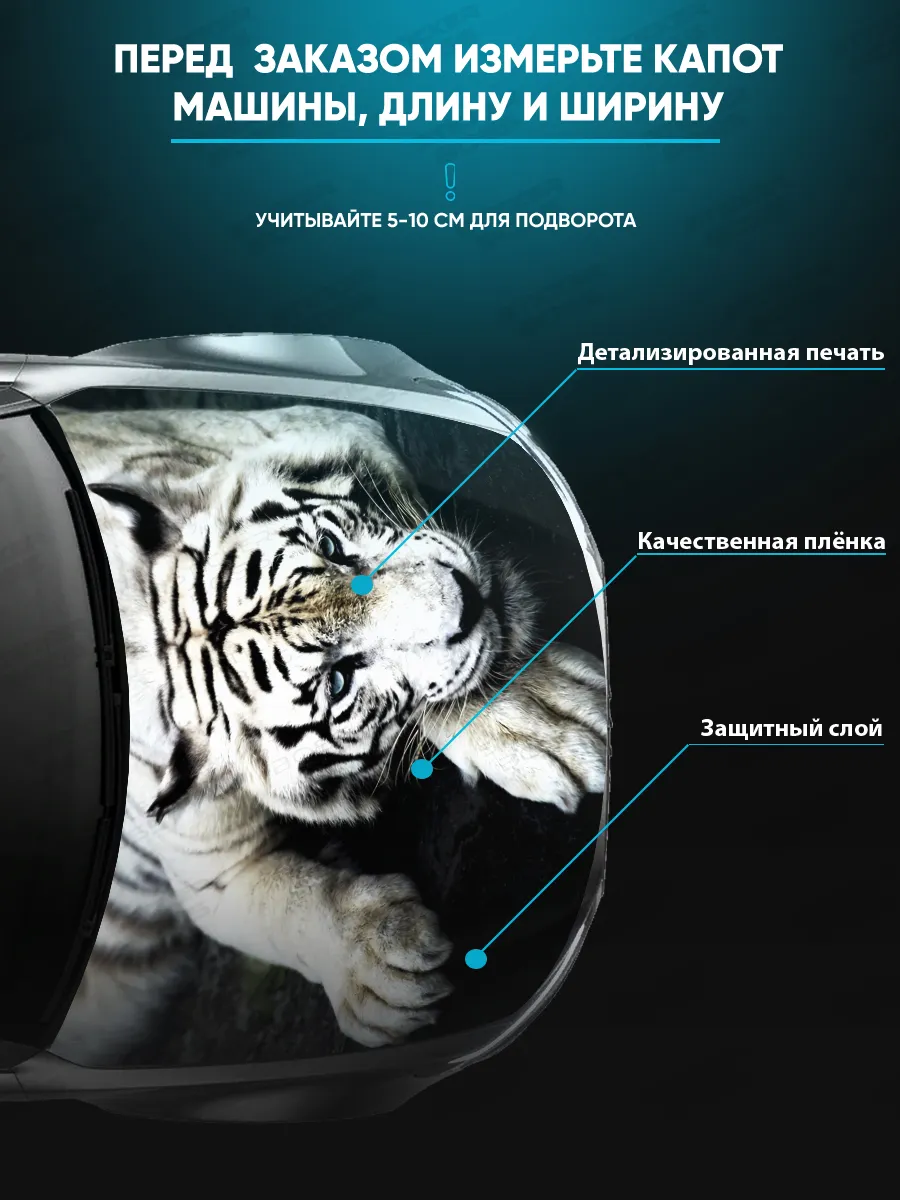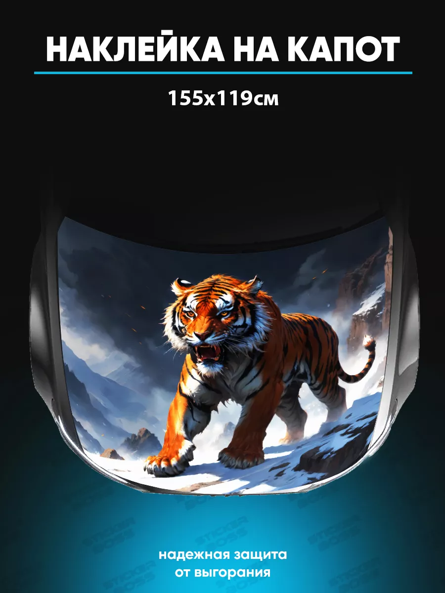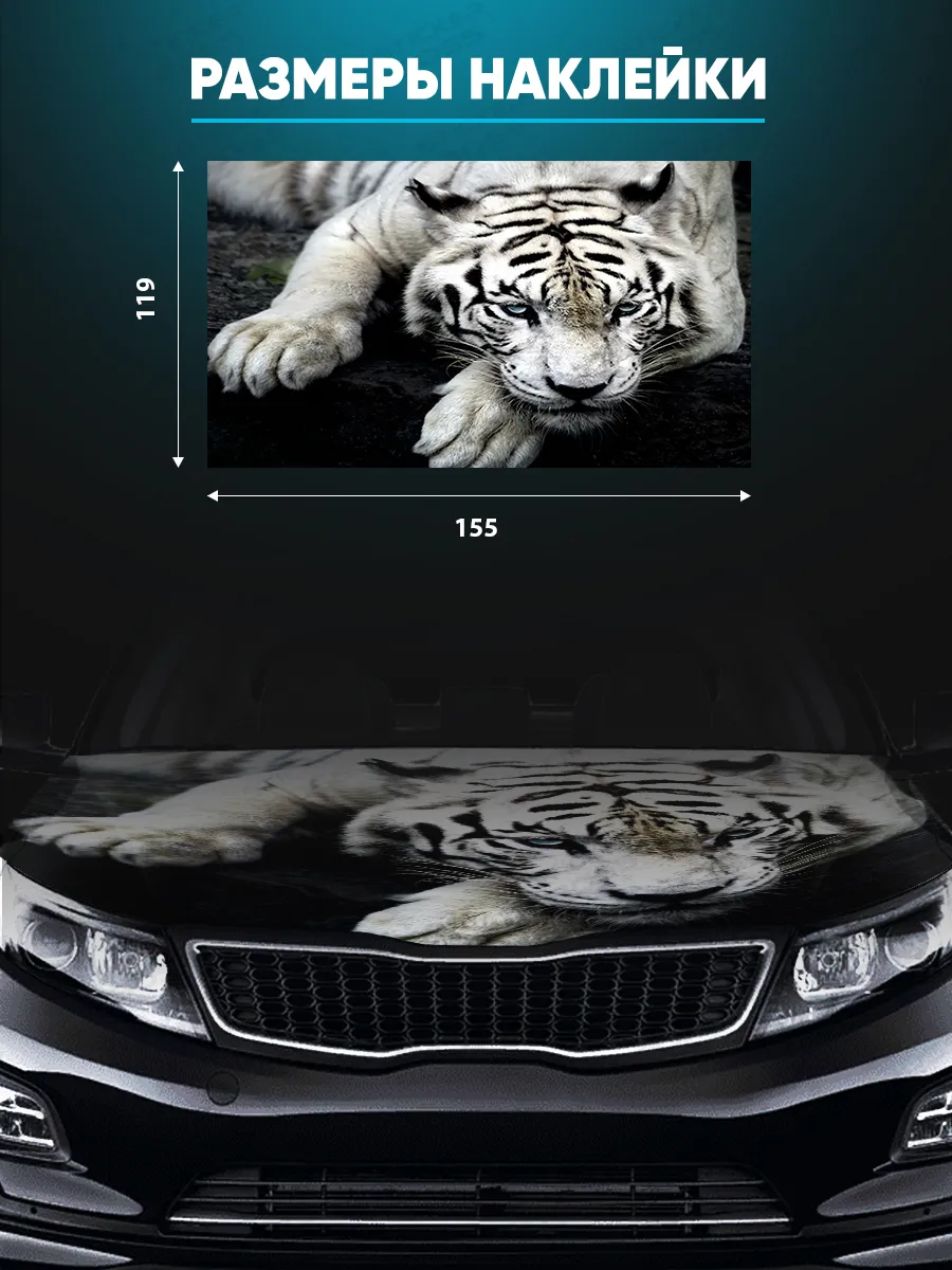 Эта наклейка на капот обеспечивает выразительный внешний вид автомобиля за счет реалистичного образа белого тигра и крупного форм-фактора. Изготовлена на самоклеящейся виниловой пленке ПВХ, которая хорошо держится на поверхностях и проста в уходе. Размер 155×119 см позволяет покрыть значительную часть капота, и при необходимости лист можно подрезать под нужный контур. При правильном нанесении стикер не отслаивается в процессе эксплуатации и не выгорает под солнцем благодаря ламинации.