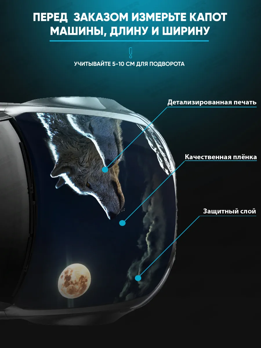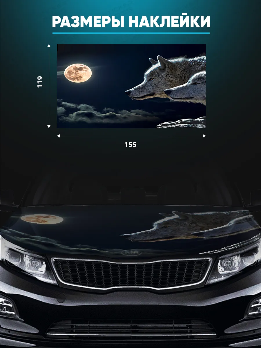 Наклейка предназначена для украшения капота автомобиля и добавления стиля и индивидуальности. В коллекции доступны различные дизайны — ночные волки, герои кино, аниме, флаги России, пейзажи и многое другое.