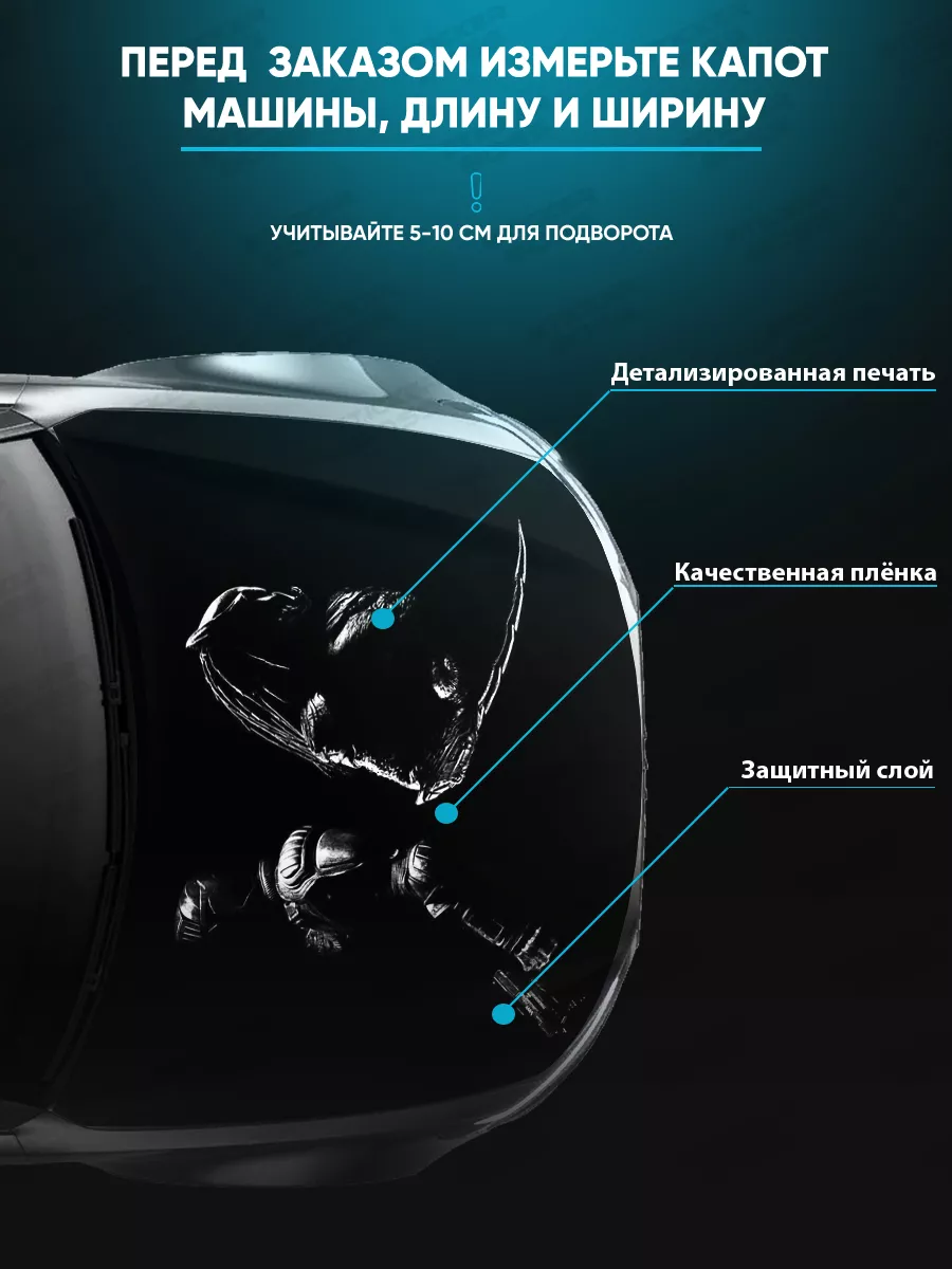 Эта наклейка на капот позволяет автомобилю выглядеть выразительно и индивидуально. Изготовлена на прочной самоклеящейся виниловой пленке ПВХ, защищена ламинацией, что повышает стойкость к солнечному трению и влаге. Размер 155х119 см обеспечивает заметный эффект на большинстве капотов.