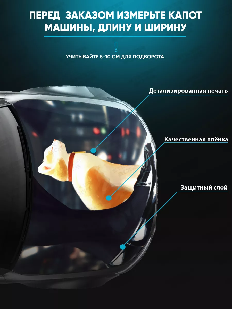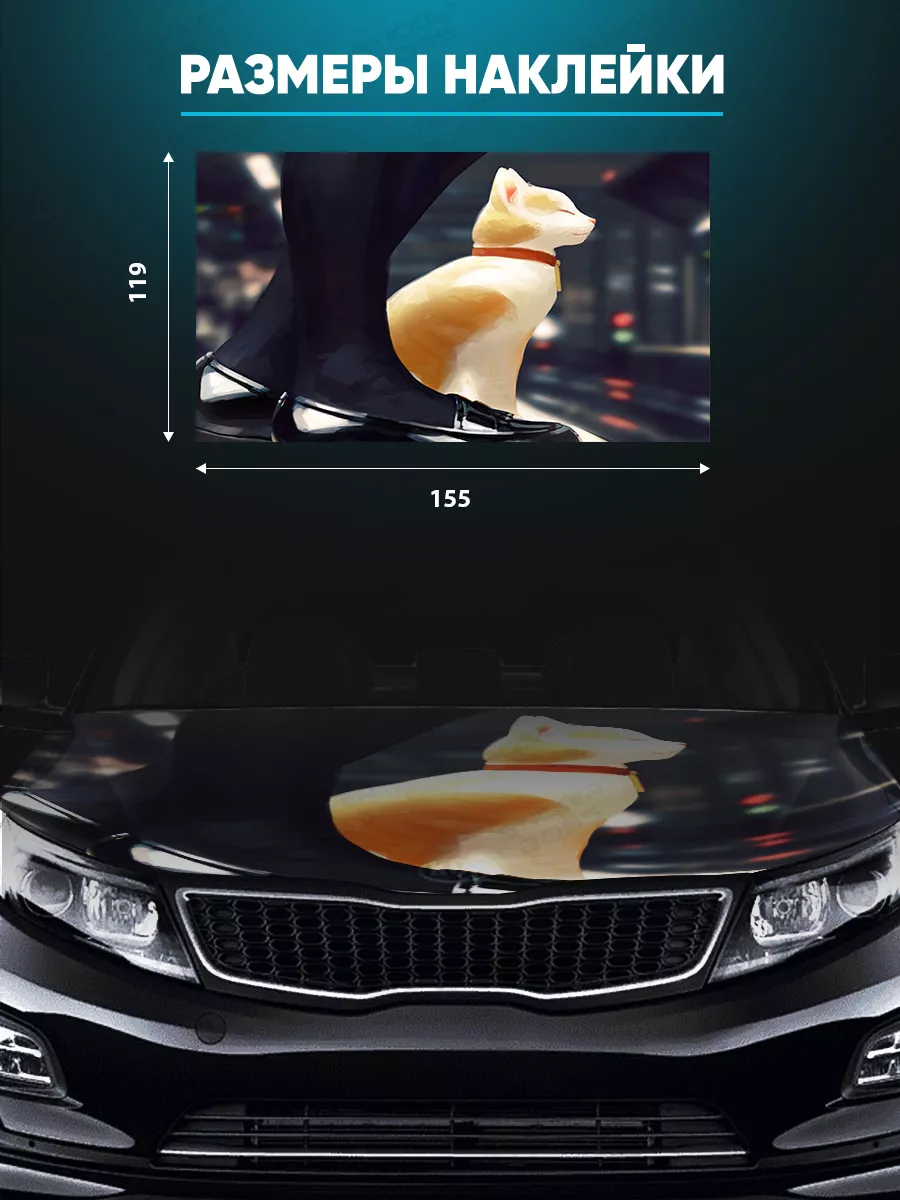 - Размер стикера 155x119 см, универсальный для капотов большинства авто.