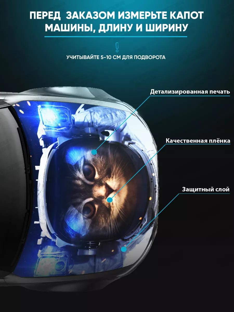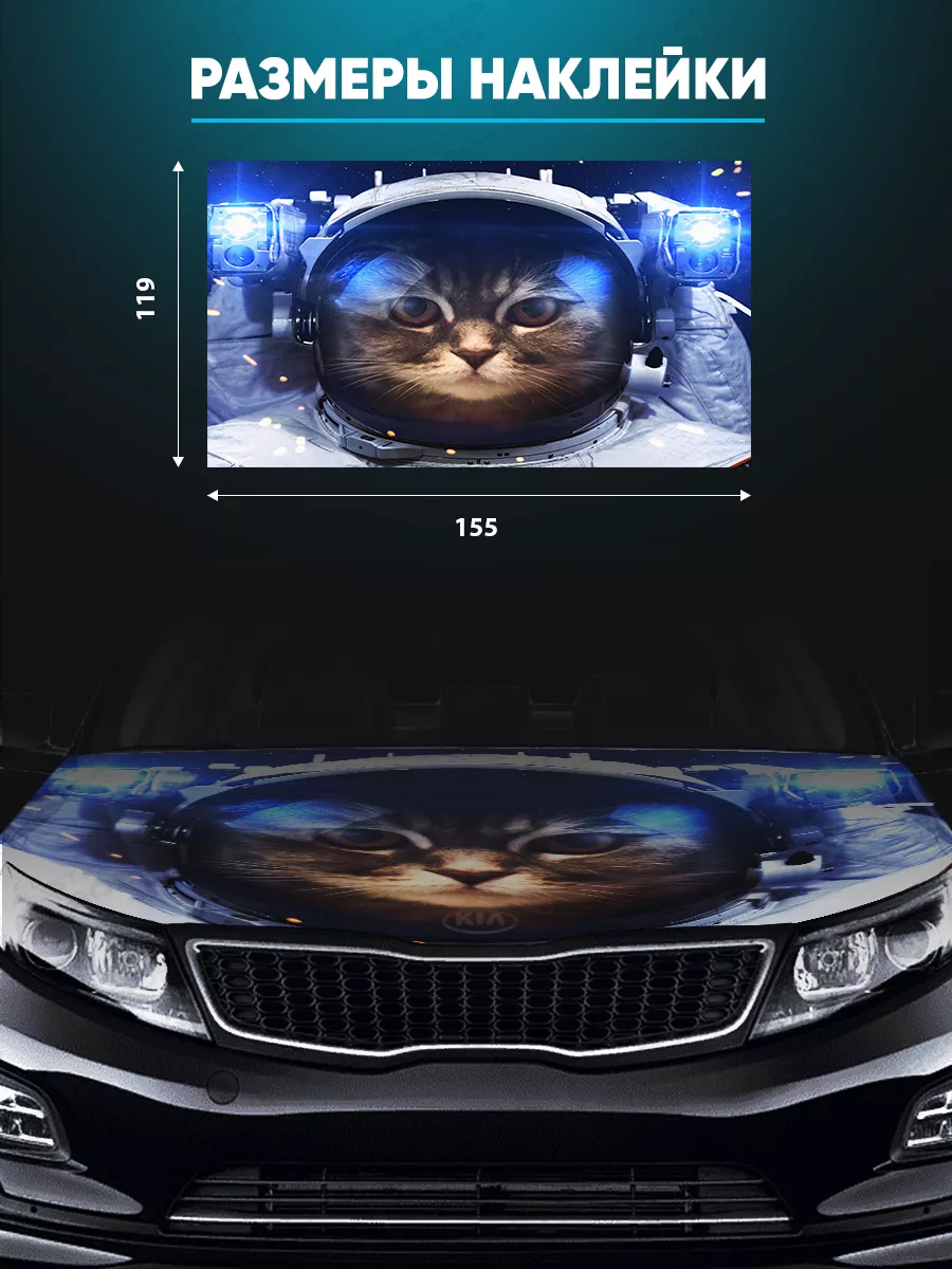 Эта большая наклейка на капот станет ярким акцентом на вашем автомобиле. Изображение милого кота в космическом стиле подчеркнет индивидуальность и взгляд на стиль. Размер 155х119 см идеально подходит для большинства капотов седанов, хэтчбеков и универсалов. Наклейка выполнена из высококачественной самоклеящейся виниловой пленки ПВХ, имеет верхний слой ламинации и рассчитана на длительный срок эксплуатации.